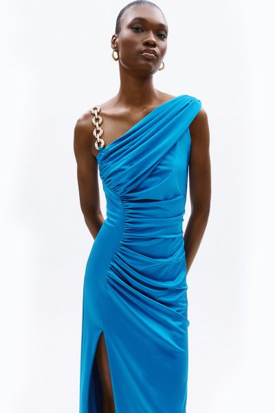 Maxi φόρεμα σε έντονο μπλε χρώμα με έναν ώμο και τιράντα από χρυσή αλυσίδα στον άλλον.
