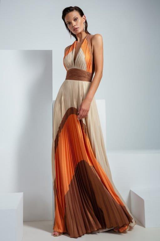 -Μακρύ φόρεμα με διάφορα print πορτοκαλί,μπεζκαι καφέ -100% pol