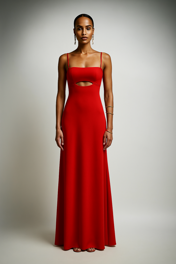 Μακρύ κόκκινο φόρεμα με διακριτικό άνοιγμα στο μπούστο