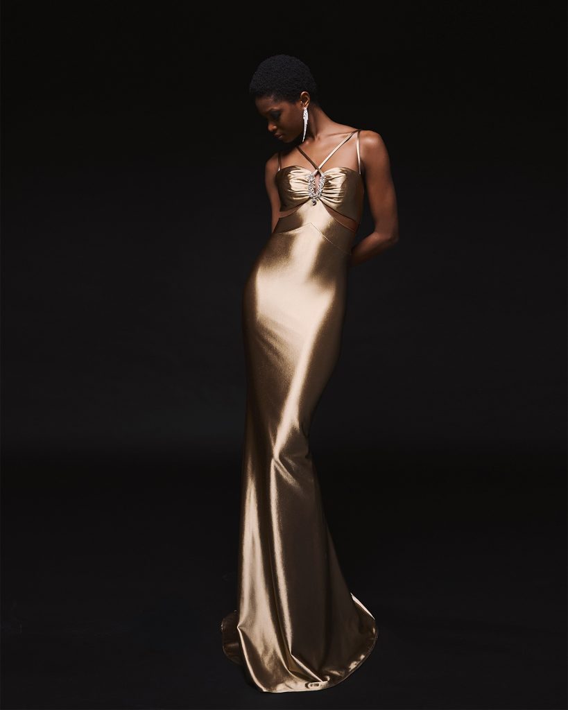 -95% Πολυέστερ, 5% Ελαστάνη. -Ένα μακρύ φόρεμα,με βαθύ V, βάτες και άνοιγμα στο πίσω μέρος της πλάτης. Η λεπτομέρεια με τα διάφανα κρύσταλλα, σε χρυσό δέσιμο κοσμούν το πίσω, πάνω μέρος της πλάτης και το κρατάνε σταθερό.