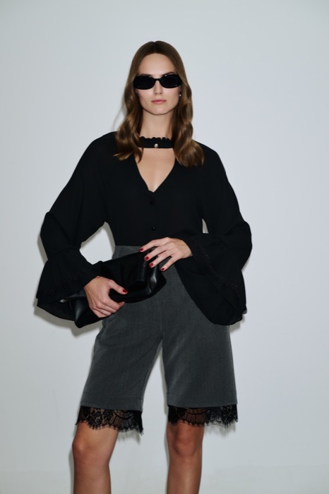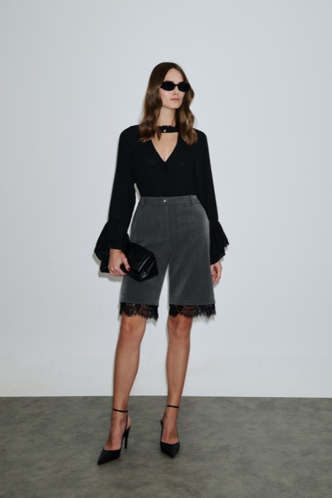 Γυναικεία βερμούδα tailored με δαντελένιο τελείωμα, για διαχρονικό και σοφιστικέ αποτέλεσμα. Ψηλόμεση, με διακοσμητικό κουμπί και λάστιχο στη μέση, ημι-φαρδιά γραμμή και ιδιαίτερη λεπτομέρεια με μαύρη φαρδιά δαντέλα στο τελείωμα. Χαρακτηριστικά: Ύφασμα: Σταθερό, ανάλαφρο Σχέδιο: Tailored, ψηλόμεση, ημι-φαρδιά γραμμή Κλείσιμο: Μεταλλικό διακοσμητικό κουμπί μπροστά Λεπτομέρεια: Μαύρη φαρδιά δαντέλα στο τελείωμα Συνδυάζεται με πουκάμισο ή τοπ για day-to-evening, σοφιστικέ εμφανίσεις. 78%Polyester -17% Rayon- 5%Elastan. Made in Greece