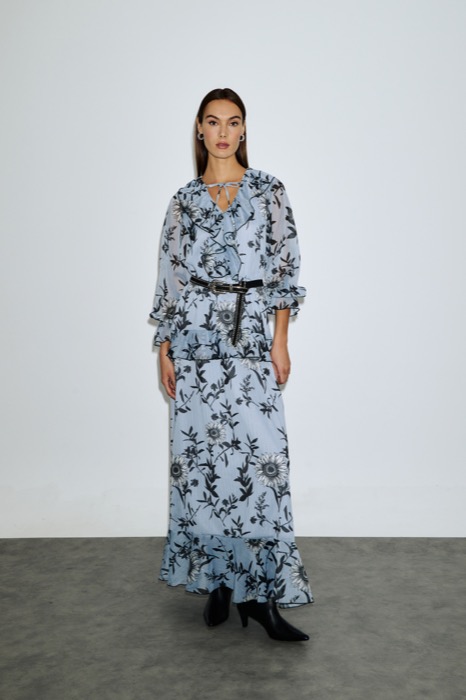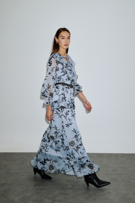 Maxi φόρεμα με ιδιαίτερο φλοράλ print σε αποχρώσεις του γκρι και εκρού, με αέρινη γραμμή και διακριτική διαφάνεια. Διαθέτει V λαιμόκοψη, μακριά balloon μανίκια και φούστα για girly, elegant style. Χαρακτηριστικά: Ύφασμα: Ανάλαφρο, δροσερό, ημιδιάφανο με εσωτερική φόδρα Print: Floral μοτίβο σε γκρι/λευκές/μπλε αποχρώσεις V cut λαιμόκοψη για θηλυκότητα Μανίκια balloon με λάστιχο στο τελείωμα Αέρινη φούστα σε ελαφριά γραμμή Ελαστική μέση για άνετη εφαρμογή Ιδανικό για day-to-night εμφανίσεις, συνδυάζεται τέλεια με μπότες ή ψηλοτάκουνα. 100%Polyester Το φόρεμα δεν διαθέτει την ζώνη