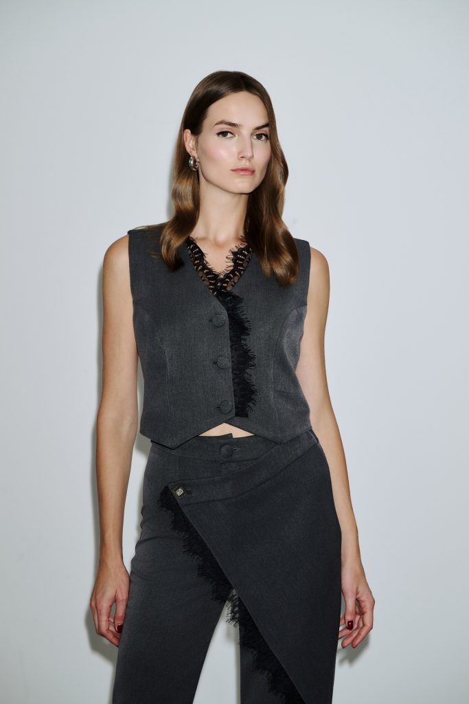 Χαρακτηριστικά Γιλέκο σε tailored γραμμή με κουμπιά μπροστά και εντυπωσιακή λεπτομέρεια με μαύρη δαντέλα κατά μήκος πατιλέτας και V λαιμόκοψης. Λεπτομέρειες: Ύφασμα: Crepe Σχέδιο: Κουμπιά & V λαιμόκοψη, μαύρη δαντέλα Παντελόνι: Ίσια γραμμή, ασύμμετρο layer, δαντελένια λεπτομέρεια Στυλ: Modern tailoring, statement minimal set, urban chic. 78%polyester-5%spandex-17%reyon Made in Greece