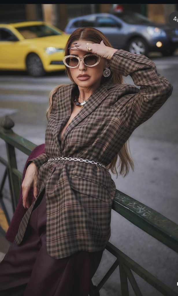 Σακάκι χωρίς γιακά Ύφασμα γκρι με ρίγα μπεζ και στρας μαύρο Έχει ζώνη για να δένει στη μέση Παντελόνι τύπου cigarette Με φερμουάρ κρυφό και λάστιχο πίσω Brand: Innocent