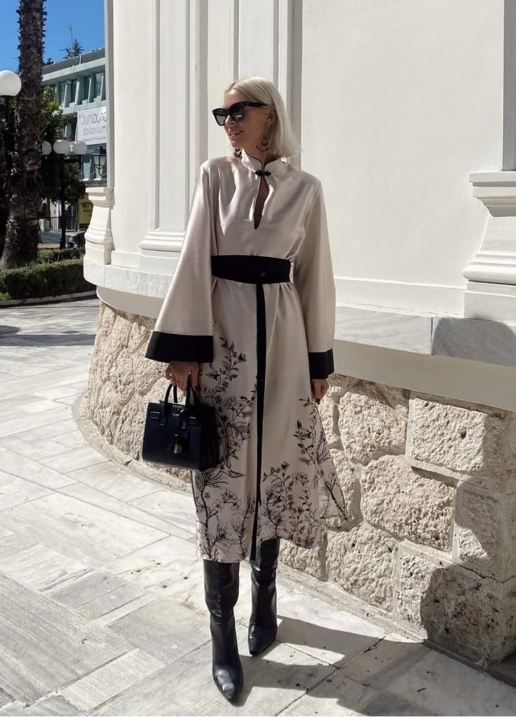 Innocent Saya Satin Dress Φόρεμα mixi Εκρού με μαύρο Ίσια προς Α γραμμή Μάο γιακάς με κούμπωμα Άνοιγμα στο ντεκολτέ Καμπάνα μανίκια Σατέν πυκνό απαλό ύφασμα Έχει λίγη ελαστικότητα Μήκος πάνω από τον αστράγαλο Άνετη εφαρμογή Επιλέξτε S για S/M & M για M/L Σύνθεση: 97% Pol, 3% Elastan