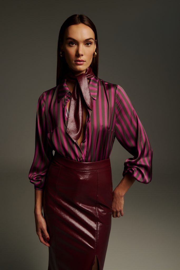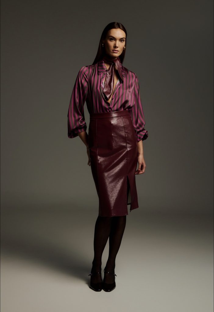Ψηλόμεση pencil φούστα από δερματίνη,με μήκος μέχρι το γόνατο και στενή εφαρμογή που αναδεικνύει τη σιλουέτα. Το σχέδιο είναι μίνιμαλ και καθαρό, με clean cut γραμμές και διακριτική ραφή στο πίσω μέρος για άνεση. Λεπτομέρειες: Χρώμα: Mπορντώ Φούστα: Ψηλόμεση, δερματίνη, pencil γραμμή, μήκος έως γόνατο Ύφος: Modern minimal sexy. 95%Polyester -5%Elastan Made in Greece