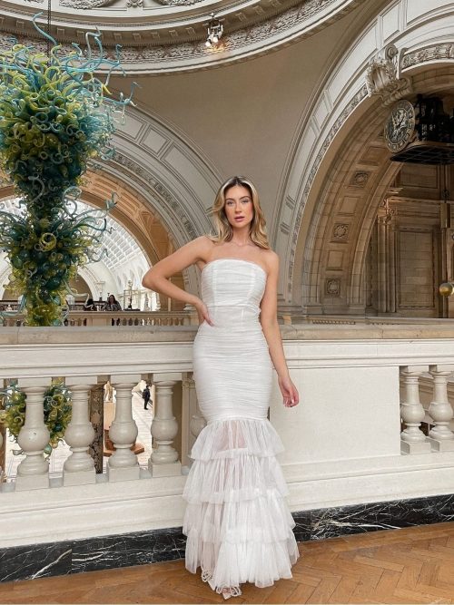 Λευκό bandeau γοργονέ μάξι φόρεμα με ύφασμα από τούλι και αποσπώμενο το κάτω κομμάτι με τα βολάν.