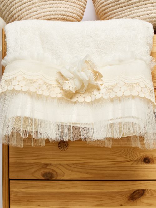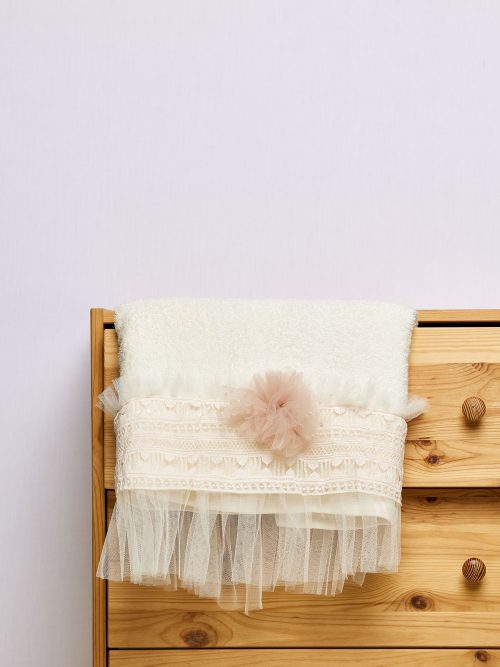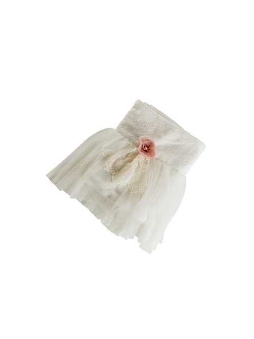 Λαδόπανα εκρού κορίτσι με εκρού δαντέλα τριαντάφυλλα και λουλούδι τούλινο