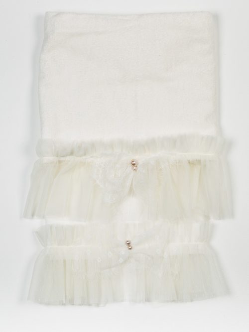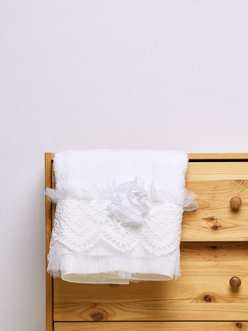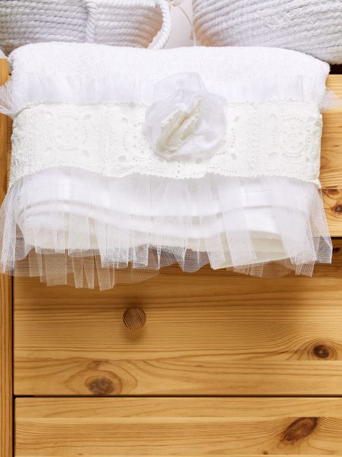 Λαδόπανα εξαιρετικής ποιότητας,σε ιδιαίτερο πάχος η πετσέτα.Η πετσέτα-μπουρνούζι έχει το ίδιο στολισμό όπως και το σεντόνι.Στην τιμή περιλαμβάνονται και τα εσώρουχα.Το συγκεκριμένο λαδόπανο ταιριάζει με μεγάλη γκάμα βαπτιστικών ρούχων που έχουν ως βάση τη λευκή δαντέλα.