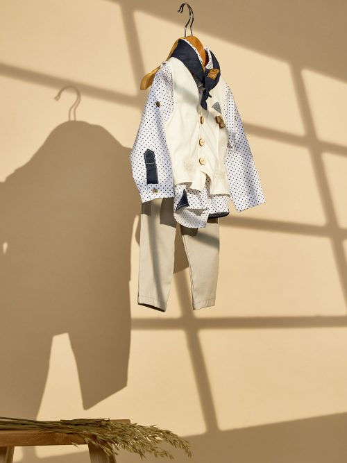 Μία επιλογή βαπτιστικού συνόλου που παραπέμπει σε μία επιλογή ανέμελη, ανεπιτίδευτη αλλά προσεγμένη στις λεπτομέρειές του. Το πουκάμισο είναι από υπόλευκη βαμβακερή μουσελίνα και έχει λεπτομέρειες από βαμβακερό δίχτυ. Το λευκό μπλουζάκι εσωτερικά ''ανοίγει'' το χρωματικό συνδυασμό του συνόλου του ρούχου και η επιλογή του εκρού παντελονιού δίνει μία αθώα και ήσυχη ματιά στο σύνολο. Στη θέση ενός πιο κλασικού γιλέκου υπάρχει το ανοιχτό πουκάμισο και το τριγωνικό φουλάρι με τα αφαιρετικά αγριολούλουδα στο σχέδιό του το οποίο μας παραπέμπει σε ένα πιο ανεπιτήδευτο look. Στην τιμή περιλαμβάνεται το ψάθινο καπέλο.