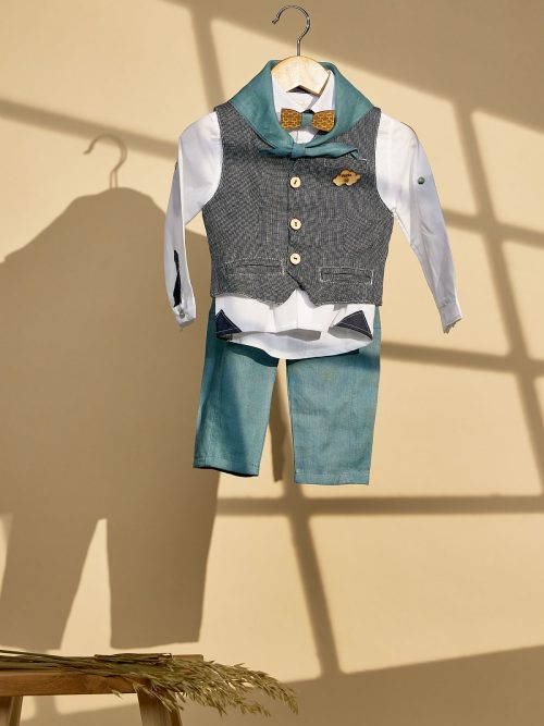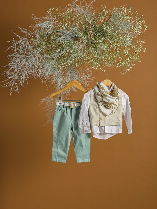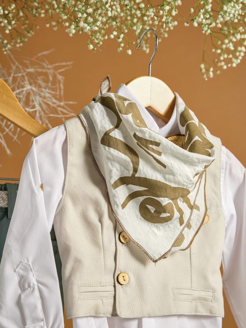 Βαπτιστικό σύνολο αγόρι με μέντα παντελόνι και γκρι-μπεζ γιλέκο με τριγωνικό φουλάρι
