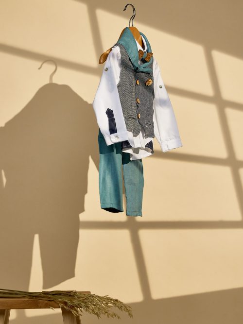 Ένα βαπτιστικό σύνολο αγόρι σε πετρόλ και μπεζ χρωματισκούς συνδυασμούς. Το μπεζ λινό γιλέκο ισορροπεί την εικόνα καθώς και το λινό φουλάρι ενώνει αρμονικά τα επιμέρους κομμάτια. Στην τιμή περιλαμβάνεται το καπέλο καβουράκι.
