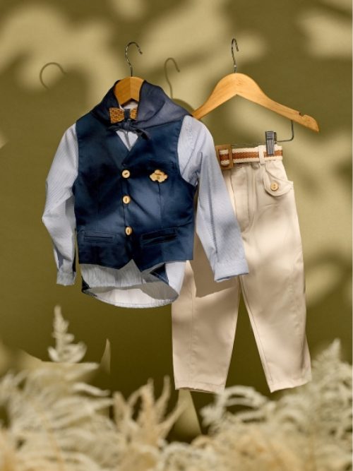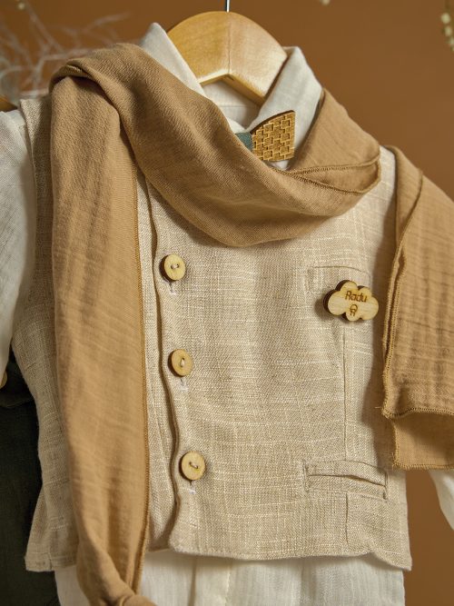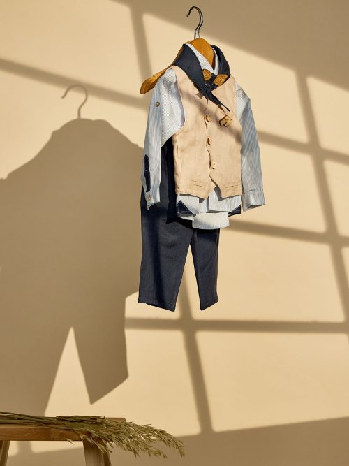 Μία επιλογή βαπτιστικού συνόλου που παραπέμπει σε σαφάαρι look με λινό παντελόνι και γιλέκο. Συνδυάζει το χακί με το μπεζ και το λευκό. Ξεχωρίζει για τα αέρινα υφάσματα από λινό(γιλέκο και παντελόνι) και από βαμβακερό πουκ΄μισο και φουλάρι.Στην τιμή περιλαμβάνεται το ψάθινο καπέλο.