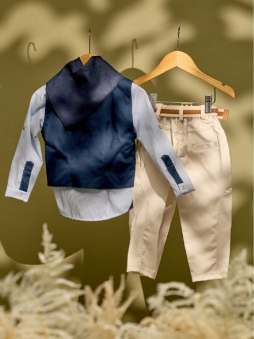 Μία επιλογή βαπτιστικού συνόλου που παραπέμπει σε μία επιλογή ανέμελη, ανεπιτίδευτη αλλά προσεγμένη στις λεπτομέρειές του. Το πουκάμισο είναι από υπόλευκη βαμβακερή μουσελίνα και έχει λεπτομέρειες από βαμβακερό δίχτυ. Το λευκό μπλουζάκι εσωτερικά ''ανοίγει'' το χρωματικό συνδυασμό του συνόλου του ρούχου και η επιλογή του χακί παντελονιού δίνει βάθος στο σύνολο. Στη θέση ενός πιο κλασικού γιλέκου υπάρχει το ανοιχτό πουκάμισο και το τριγωνικό φουλάρι με τα αφαιρετικά αγριολούλουδα στο σχέδιό του το οποίο μας παραπέμπει σε ένα πιο ανεπιτήδευτο look. Στην τιμή περιλαμβάνεται το ψάθινο καπέλο.