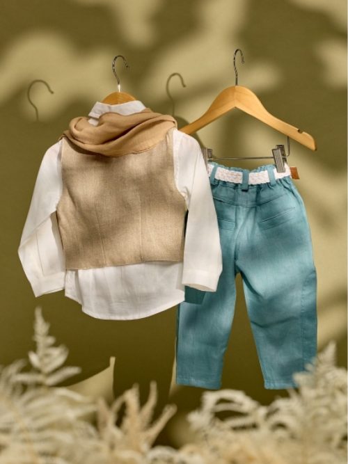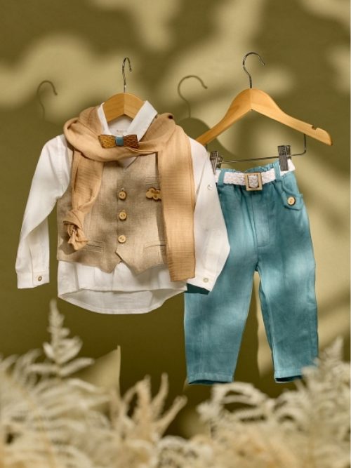 Βαπτιστικό σύνολο αγόρι με πετρόλ λινό ύφασμα και μπεζ γιλέκο