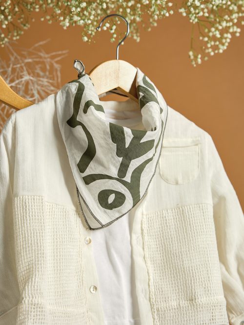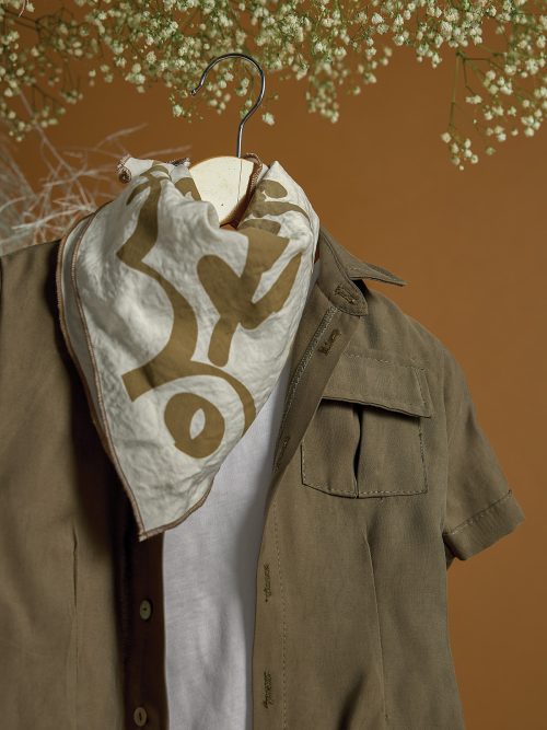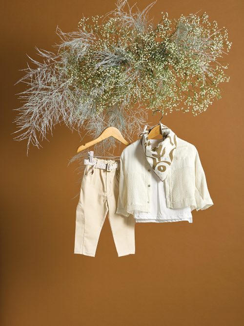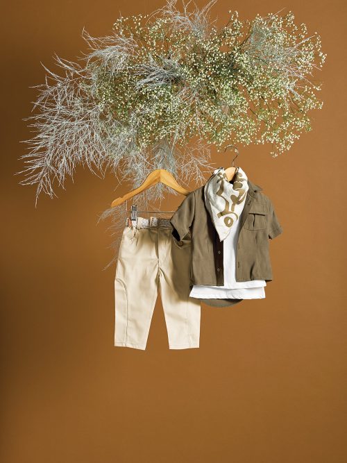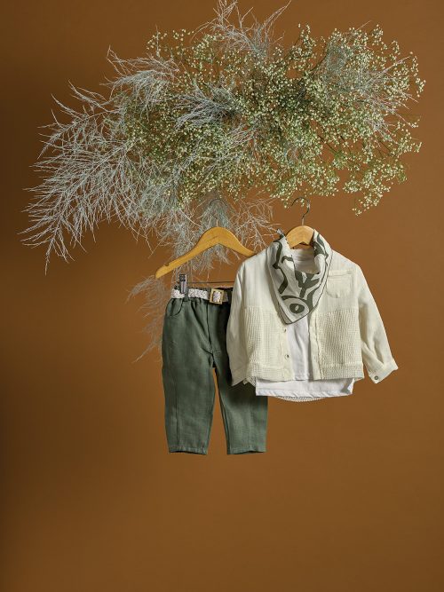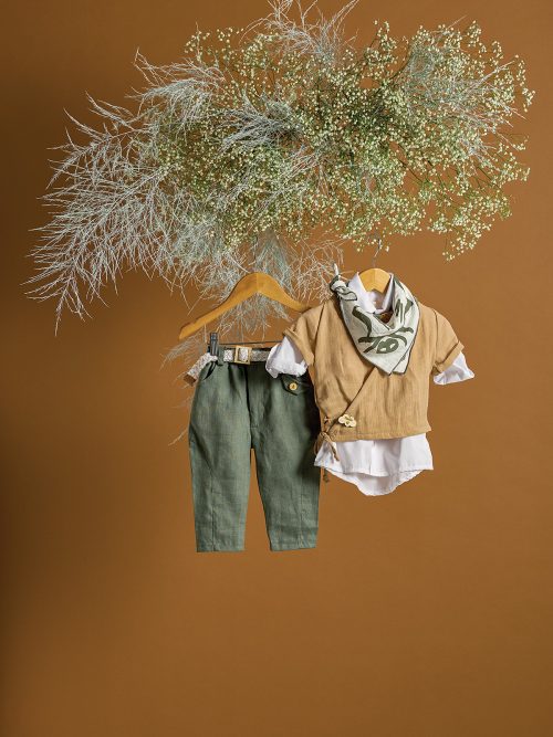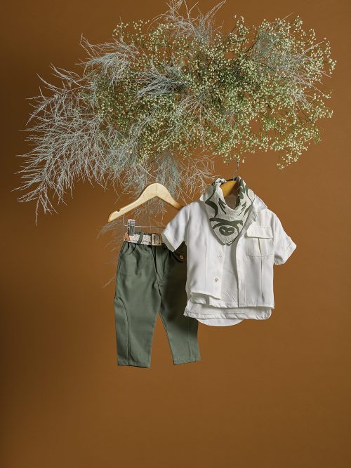 Μία επιλογή βαπτιστικού συνόλου που παραπέμπει σε σαφάρι look με χακί πουκάμισο με χυτό ύφασμα και μία τσέπη με πιετα στο αριστερό μέρος. Εσωτερικά το λευκό βαμβακερό μπλουζάκι τονίζει τη safari αισθητική του καθώς και το τριγωνικό φουλάρι με τα αφαιρετικά αγριολούλουδα στο σχέδιό του μας παραπέμπει σε ένα ανεπιτήδευτο look. Το παντελόνι είναι ελαφρώς ελαστικό σε ένα ζεστό παλ εκρού χρώμα. Στην τιμή περιλαμβάνεται το ψάθινο καπέλο.