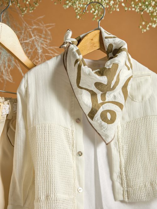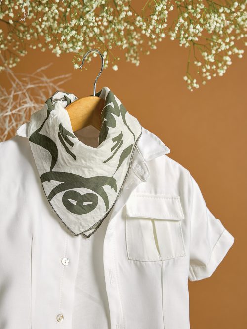 Μία επιλογή βαπτιστικού συνόλου που παραπέμπει σε σαφάρι look με υπόλευκο πουκάμισο με χυτό ύφασμα και μία τσέπη με πιέτα στο αριστερό μέρος. Εσωτερικά το λευκό βαμβακερό μπλουζάκι τονίζει τη safari αισθητική του καθώς και το τριγωνικό φουλάρι με τα αφαιρετικά αγριολούλουδα στο σχέδιό του μας παραπέμπει σε ένα ανεπιτήδευτο look. Το παντελόνι είναι ελαφρώς ελαστικό σε ένα ζεστό χακί χρώμα. Στην τιμή περιλαμβάνεται το ψάθινο καπέλο.