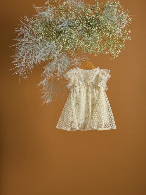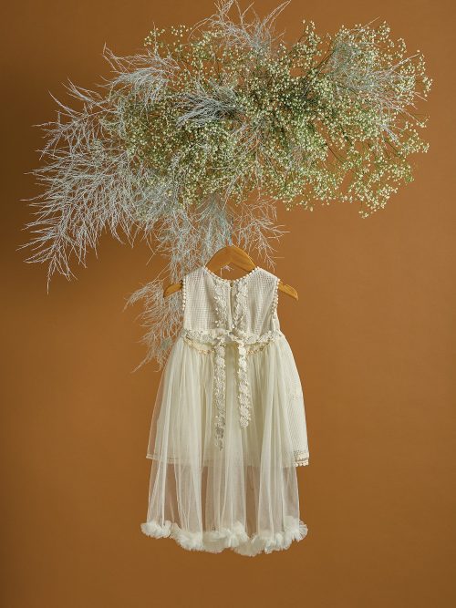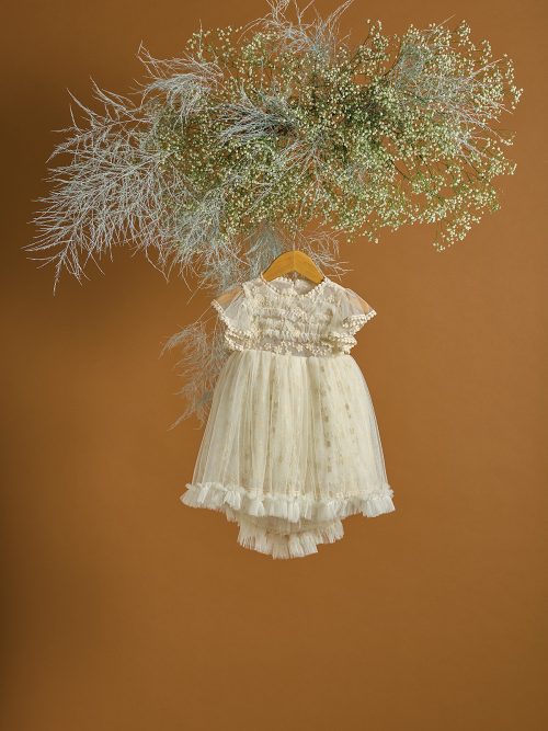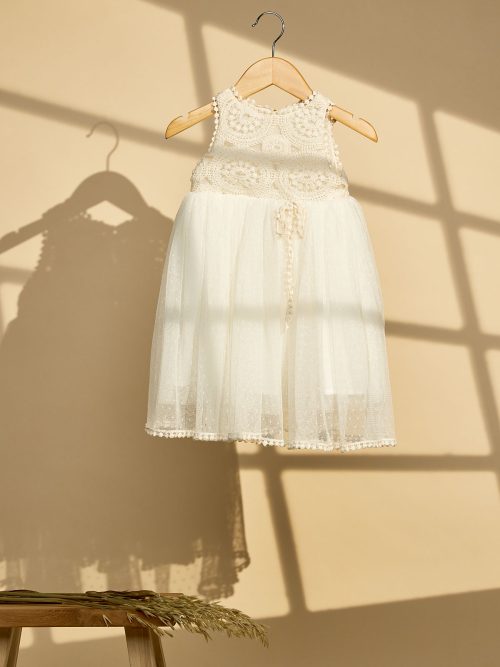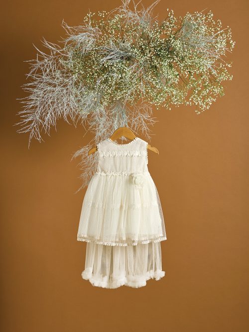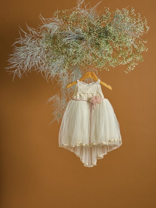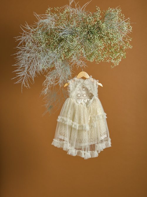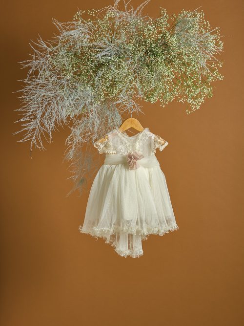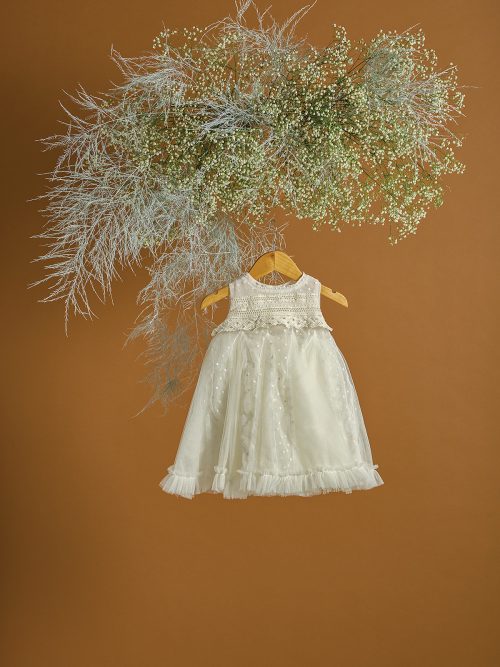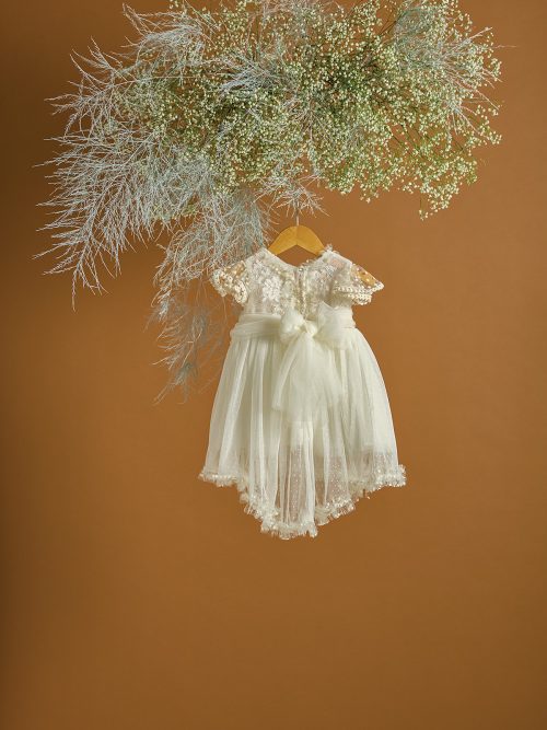 Ένα βαπτιστικό φόρεμα σε εκρού χρώμα με ψιλό βαμβακερό δίχτυ, το οποίο λειτουργεί ως καμβάς πάνω στον οποίο τοποθετούνται οι δαντέλες. Η συγκεκριμένη δαντέλα από τριανταφυλλάκια δίνει ένα ρομαντικό χαρακτήρα στο φόρεμα. Η συγκεκριμένη επιλογή φορέματος είναι σίγουρα για τις βαπτίσεις που θέλουμε να επιτύχουμε ένα πιο ήσυχο και απέριττο αποτέλεσμα. Η ιδιαιτερότητά του έγκειται στο γεγονός ότι χρησιμοποιείται το ψιλό βαμβακερό δίχτυ, το οποίο σε συνδυασμό με την ψιλή δαντελένια τρέσα να δημιουργείται ένα πιο αφαιρετικό αποτέλεσμα χωρίς υπερβολικές δαντέλες και ''βαριές'' επιλογές υφασμάτων. Η πιο βασική όμως διαφοροποίηση συναντάται στην υπάρξη της μακριάς τούλινης ουράς με σουρωμένη τούλινη τρέσα στο τελείωμά της, η οποία προσθαφαιρείται για ένα πιο έντονο και πιο ήσυχο αποτέλεσμα. Συνδυάστε το με εκρού τσάντα και με εκρού πλακέ λαμπάδα για να τονιστεί η ρομαντική του αίσθηση. Συνδυάστε το με εκρού τσάντα και αποξηραμμένα λουλούδια του αγρού για ένα πιο ανεπιτήδευτο look. Στην τιμή περιλαμβάνεται και η τούλινη κορδέλα για τα μαλλιά.