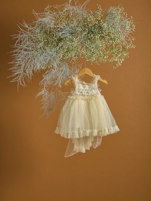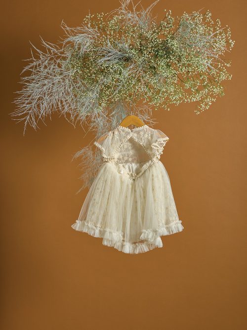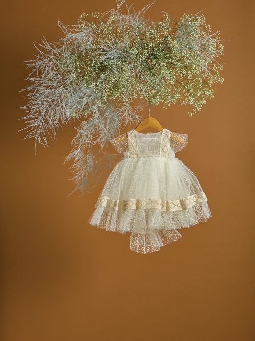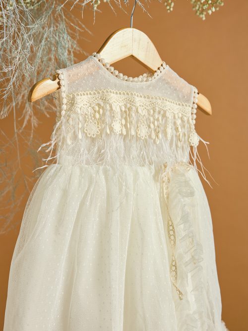 Ένα βαπτιστικό φόρεμα σε εκρού χρώμα με μια ιδιαίτερη δαντέλα τρέσσα με κρεμαστές απολήξεις, οι οποίες και δίνουν κίνηση. Η κίνηση αυτή τονίζεται και με τα αέρινα φτερά στο μπούστο του φορέματος. Το τούλι είναι από ψιλό πουά στην ύφανσή του. Στη μέση προστέθηκε και τρέσσες από σουρωμενο τούλι για έξτρα ογκο αι κίνηση. Συνδυάστε το με εκρού τσάντα και αποξηραμμένα λουλούδια του αγρού για ένα πιο ανεπιτήδευτο look.Στην τιμή περιλαμβάνεται και η τούλινη κορδέλα για τα μαλλιά.