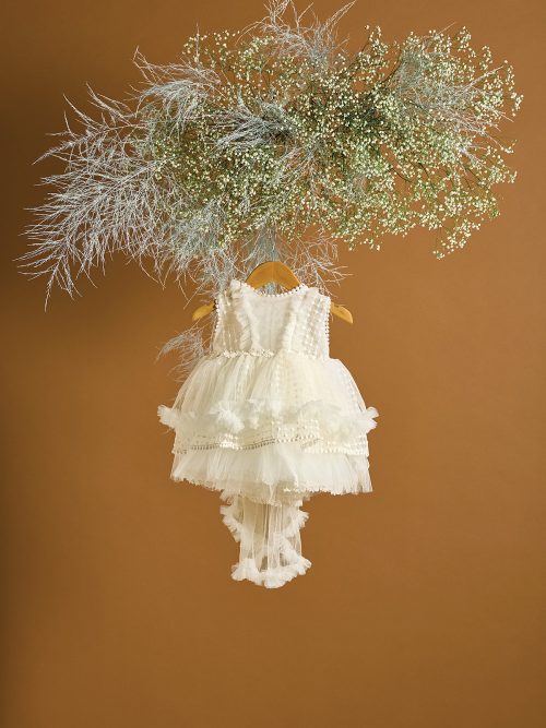 Ένα βαπτιστικό φόρεμα σε εκρού χρώμα με την αγαπημένη μας ουρά στο πίσω μέρος.Η δαντέλα στο μπούστο και στην πλάτη συναντάται και στο τε΄λειωμα του φορέματος κάτω από τα διαφανή τύλια.Με αυτόν τον τρόπο δημιουργείται μία κίνηση στο φόρεμα. Η ψιλή δαντέλα στ τελέιωμ του φορέματος στο εξωτερικό τούλι δημιουργεί ένα περίγραμμα στο φόρεμα τονίζοντας το σχήμα του. Συνδυάστε το με εκρού τσάντα και αποξηραμμένα λουλούδια του αγρού για ένα πιο ανεπιτήδευτο look.Στην τιμή περιλαμβάνεται και η τούλινη κορδέλα για τα μαλλι