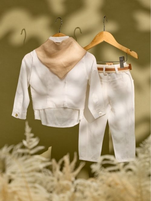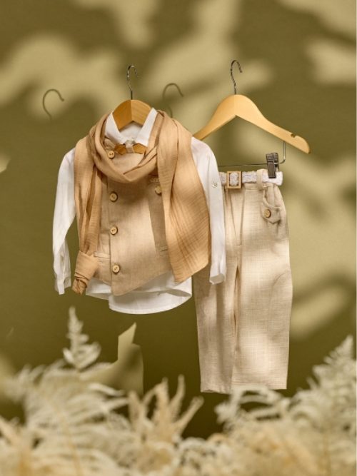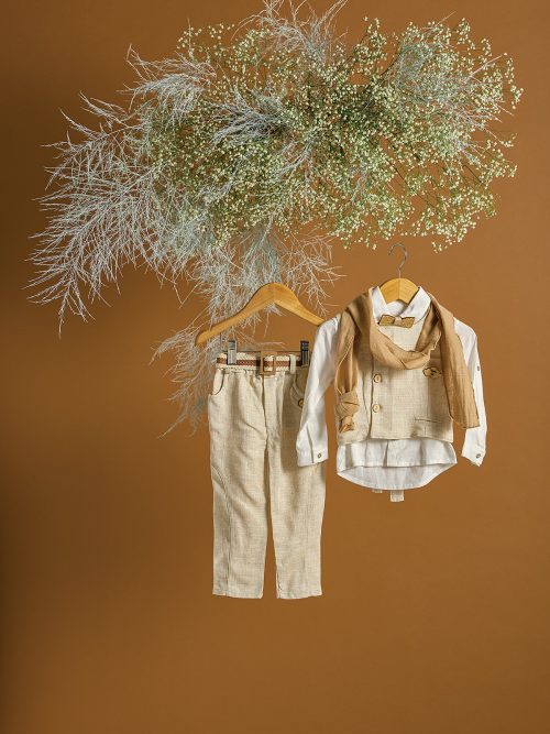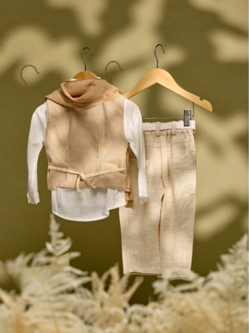 Βαπτιστικό σύνολο μπεζ λινό παντελόνι με μπεζ γιλέκο