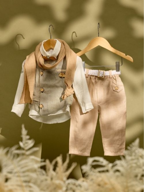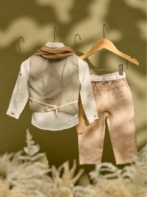 Βαπτιστικό σύνολο μπεζ λινό παντελόνι με χακί γιλέκο