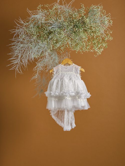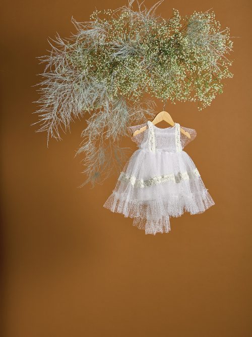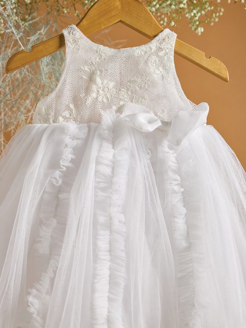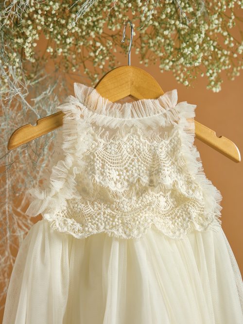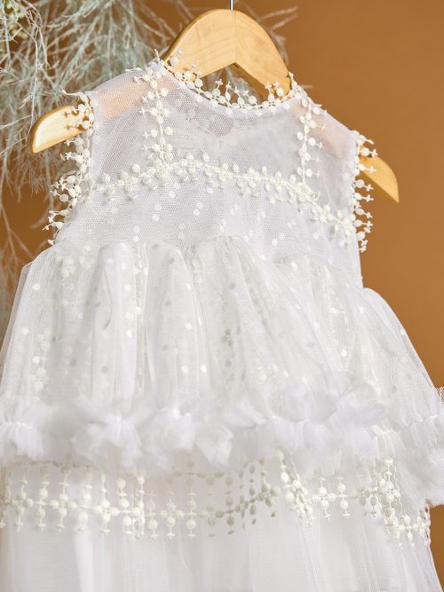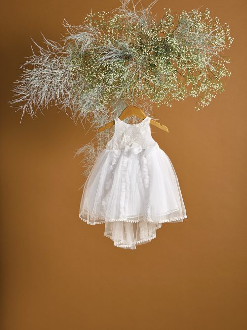 Ένα βαπτιστικό φόρεμα σε λευκό χρώμα με μια ιδιαίτερη δαντέλα γκυπούρ και πουά αγαπημένη τούλινη ουρά. Τη δαντέλα τη συναντάμε και στο μπούστο δημιουργώντας την εικόνα της τιράντας ,με την ιδιαιτερότητα ότι είναι ραμμένη επάνω στο τούλινο μπούστο. Χαρακτηριστικό του συγκεκριμένου φορέματος είναι τα layers από τούλι και από δαντέλες καθώς και η πιο ''θεατρική'' ουρά από τούλι. Συνδυάστε το με λευκή καπελιέρα με αποξηραμένα λουλούδια του αγρού για ένα πιο ανεπιτήδευτο look. Στην τιμή περιλαμβάνεται και η τούλινη κορδέλα για τα μαλλιά.