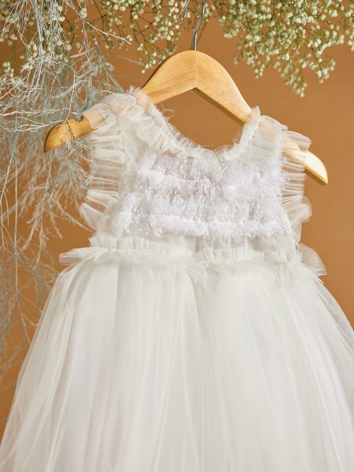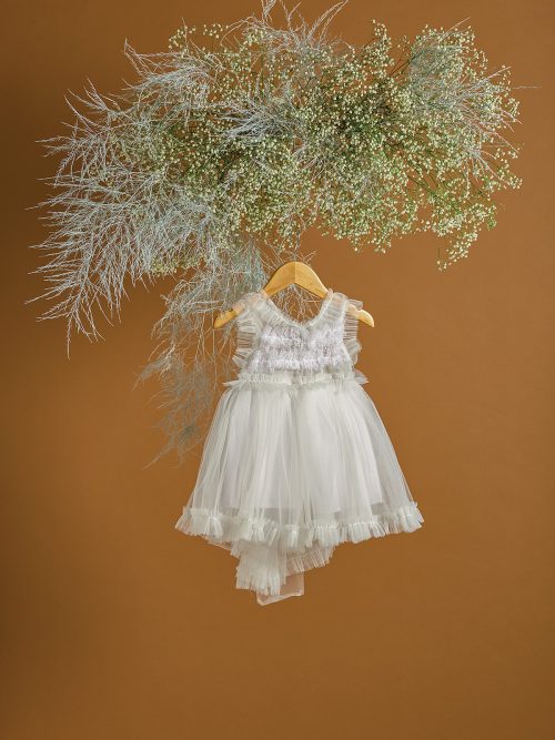Ένα βαπτιστικό φόρεμα σε εκρού χρώμα με μια ιδιαίτερη δαντέλα τρέσσα με κρεμαστές απολήξεις, οι οποίες και δίνουν κίνηση. Η κίνηση αυτή τονίζεται και με τα αέρινα φτερά στο μπούστο του φορέματος. Το τούλι είναι από ψιλό πουά στην ύφανσή του. Στη μέση προστέθηκε και τρέσσες από σουρωμενο τούλι για έξτρα ογκο αι κίνηση. Συνδυάστε το με εκρού τσάντα και αποξηραμμένα λουλούδια του αγρού για ένα πιο ανεπιτήδευτο look.Στην τιμή περιλαμβάνεται και η τούλινη κορδέλα για τα μαλλιά.