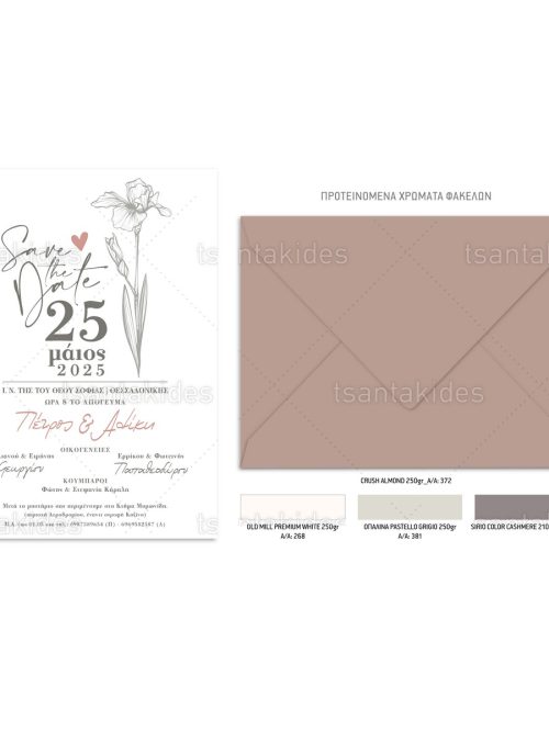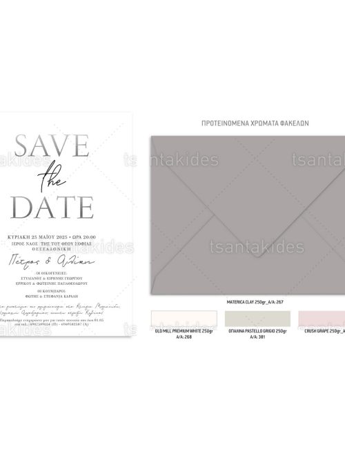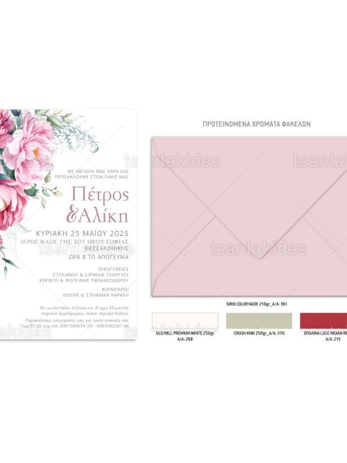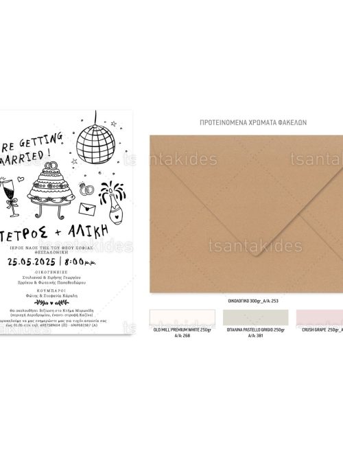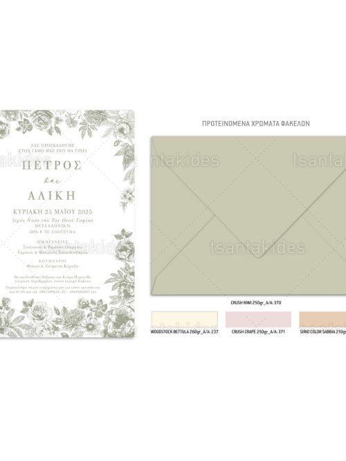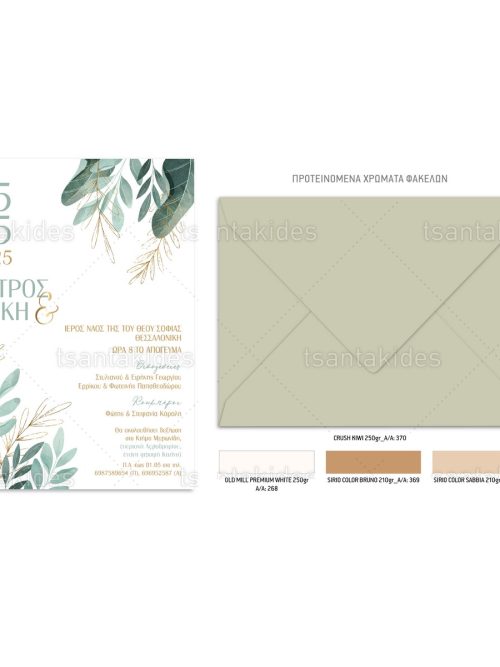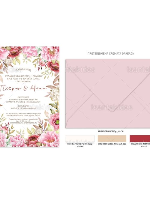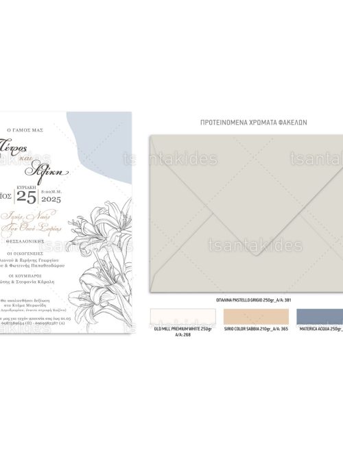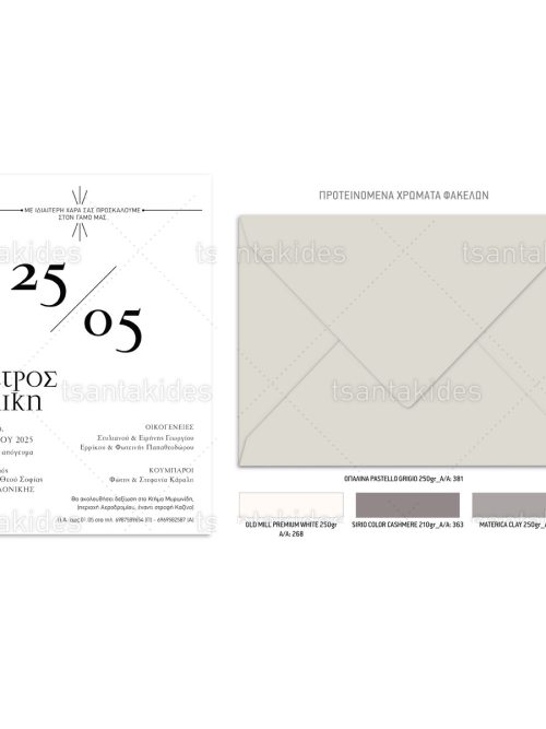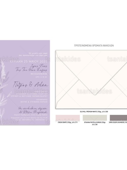 Το προσκλητήριο διαθέτει φάκελο διάστασης 15x22cm σε χαρτί της επιλογής σας από τους αναγραφόμενους κωδικούς.