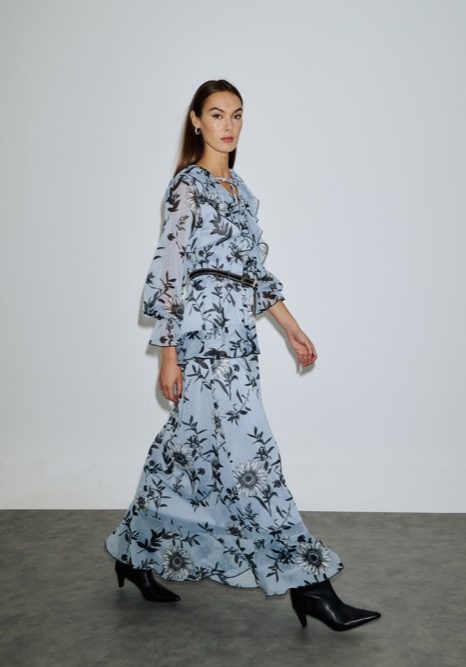 Maxi φόρεμα με ιδιαίτερο φλοράλ print σε αποχρώσεις του γκρι και εκρού, με αέρινη γραμμή και διακριτική διαφάνεια. Διαθέτει V λαιμόκοψη, μακριά balloon μανίκια και φούστα για girly, elegant style.