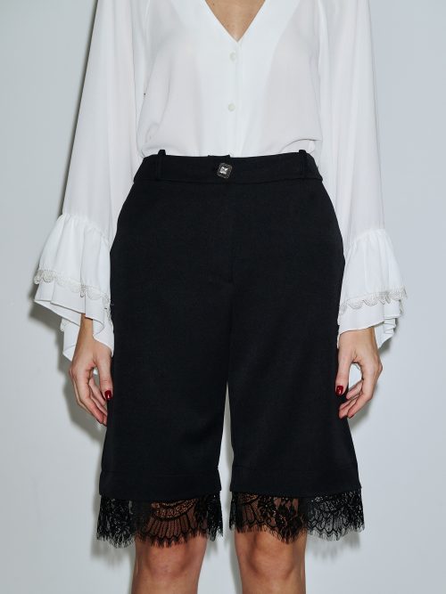 Γυναικεία βερμούδα tailored με δαντελένιο τελείωμα, για διαχρονικό και σοφιστικέ αποτέλεσμα. Ψηλόμεση, με διακοσμητικό κουμπί και λάστιχο στη μέση, ημι-φαρδιά γραμμή και ιδιαίτερη λεπτομέρεια με μαύρη φαρδιά δαντέλα στο τελείωμα.