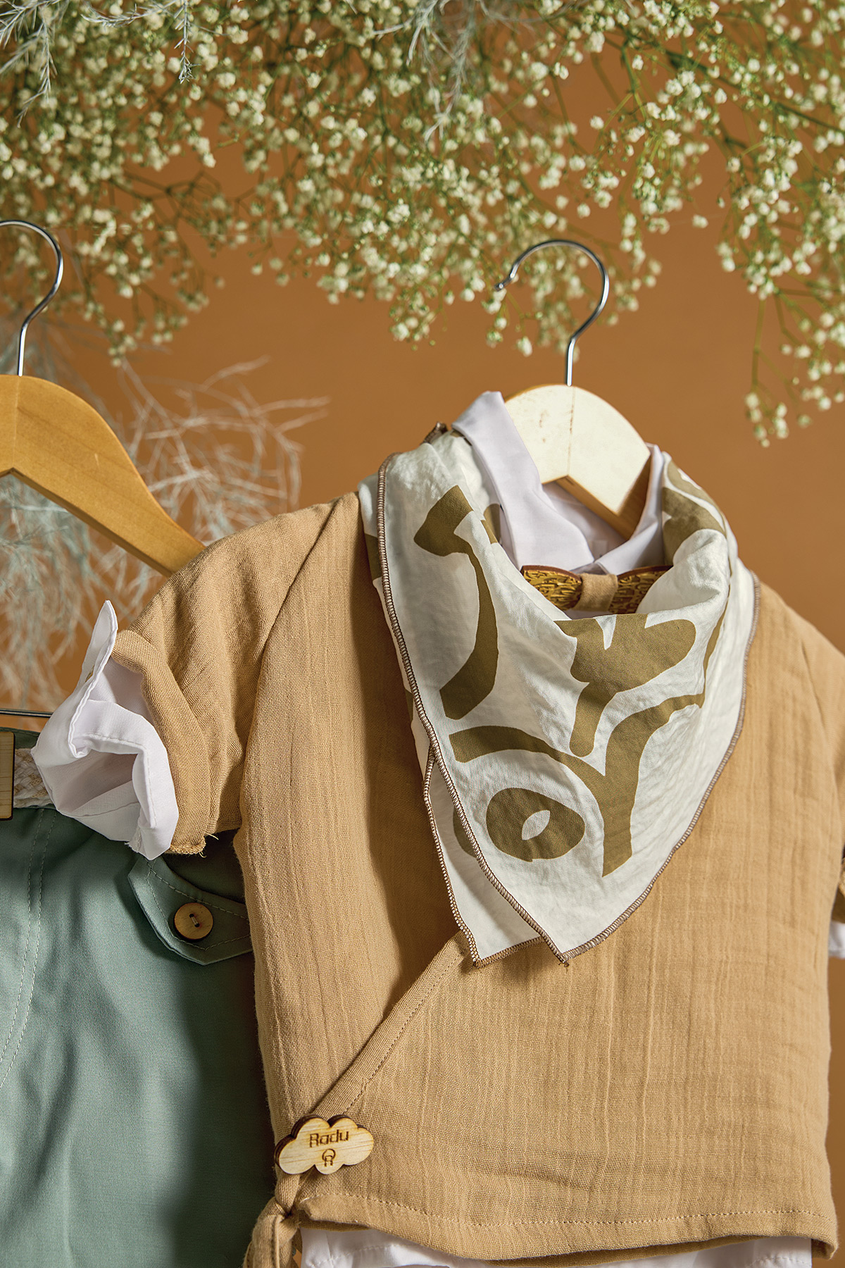 Μία επιλογή βαπτιστικού συνόλου που παραπέμπει σε μία επιλογή ανέμελη, ανεπιτίδευτη αλλά προσεγμένη στις λεπτομέρειές του. Το πουκάμισο είναι από υπόλευκη βαμβακερή μουσελίνα και έχει λεπτομέρειες από βαμβακερό δίχτυ. Το λευκό μπλουζάκι εσωτερικά ''ανοίγει'' το χρωματικό συνδυασμό του συνόλου του ρούχου και η επιλογή του εκρού παντελονιού δίνει μία αθώα και ήσυχη ματιά στο σύνολο. Στη θέση ενός πιο κλασικού γιλέκου υπάρχει το ανοιχτό πουκάμισο και το τριγωνικό φουλάρι με τα αφαιρετικά αγριολούλουδα στο σχέδιό του το οποίο μας παραπέμπει σε ένα πιο ανεπιτήδευτο look. Στην τιμή περιλαμβάνεται το ψάθινο καπέλο.