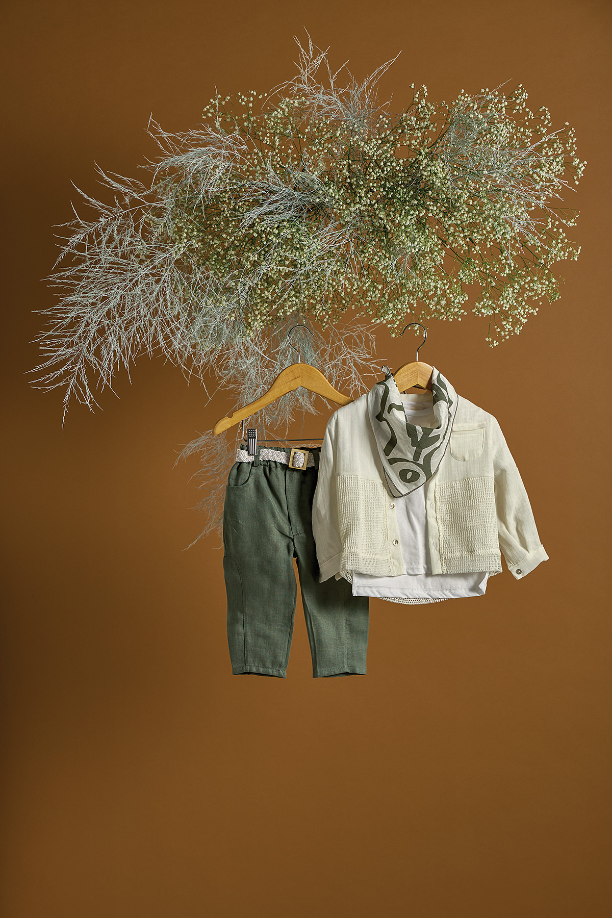 Μία επιλογή βαπτιστικού συνόλου που παραπέμπει σε μία επιλογή ανέμελη, ανεπιτίδευτη αλλά προσεγμένη στις λεπτομέρειές του. Το πουκάμισο είναι από υπόλευκη βαμβακερή μουσελίνα και έχει λεπτομέρειες από βαμβακερό δίχτυ. Το λευκό μπλουζάκι εσωτερικά ”ανοίγει” το χρωματικό συνδυασμό του συνόλου του ρούχου και η επιλογή του χακί παντελονιού δίνει βάθος στο σύνολο. Στη θέση ενός πιο κλασικού γιλέκου υπάρχει το ανοιχτό πουκάμισο και το τριγωνικό φουλάρι με τα αφαιρετικά αγριολούλουδα στο σχέδιό του το οποίο μας παραπέμπει σε ένα πιο ανεπιτήδευτο look. Στην τιμή περιλαμβάνεται το ψάθινο καπέλο.