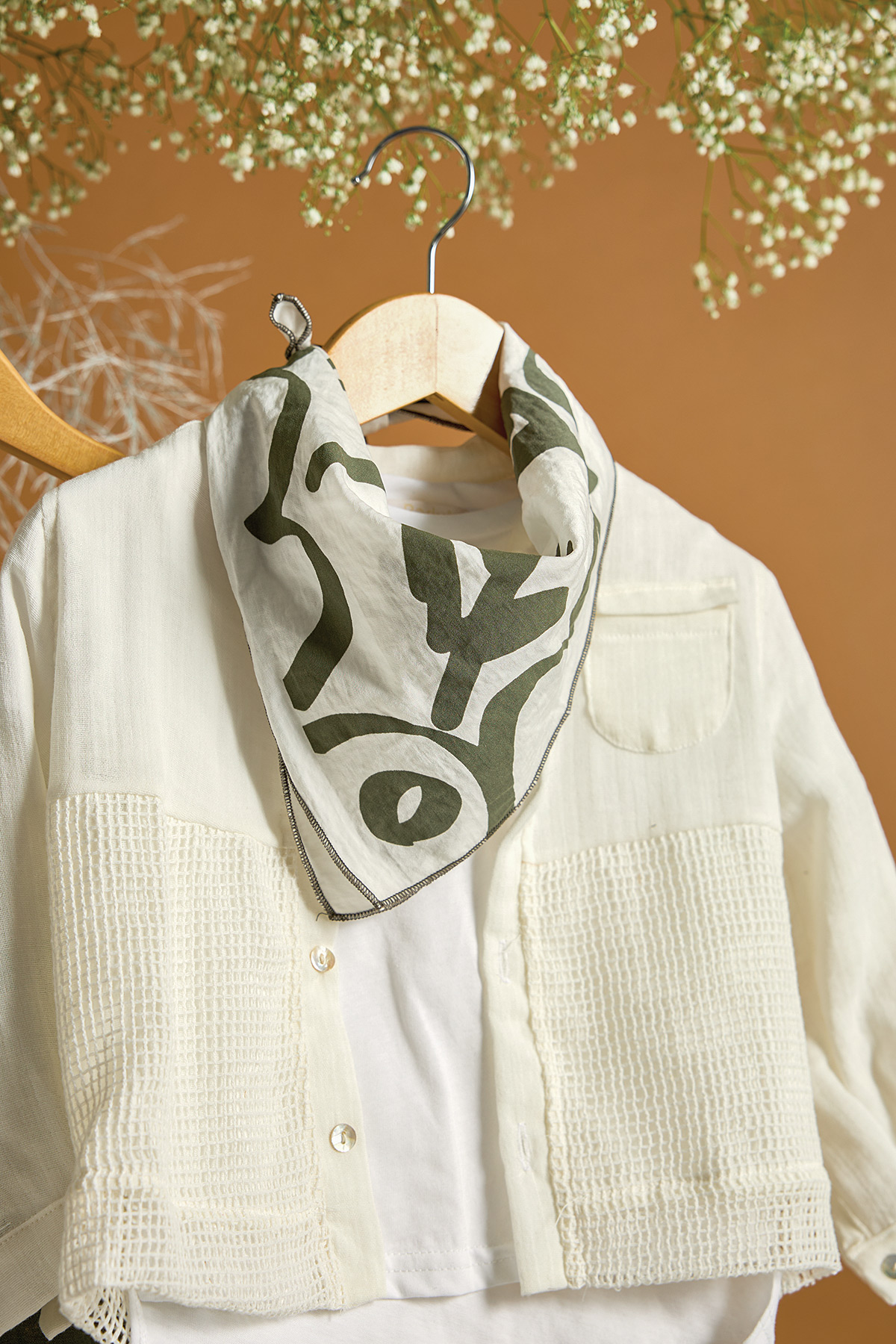 Μία επιλογή βαπτιστικού συνόλου που παραπέμπει σε μία επιλογή ανέμελη, ανεπιτίδευτη αλλά προσεγμένη στις λεπτομέρειές του. Το πουκάμισο είναι από υπόλευκη βαμβακερή μουσελίνα και έχει λεπτομέρειες από βαμβακερό δίχτυ. Το λευκό μπλουζάκι εσωτερικά ''ανοίγει'' το χρωματικό συνδυασμό του συνόλου του ρούχου και η επιλογή του εκρού παντελονιού δίνει μία αθώα και ήσυχη ματιά στο σύνολο. Στη θέση ενός πιο κλασικού γιλέκου υπάρχει το ανοιχτό πουκάμισο και το τριγωνικό φουλάρι με τα αφαιρετικά αγριολούλουδα στο σχέδιό του το οποίο μας παραπέμπει σε ένα πιο ανεπιτήδευτο look. Στην τιμή περιλαμβάνεται το ψάθινο καπέλο.
