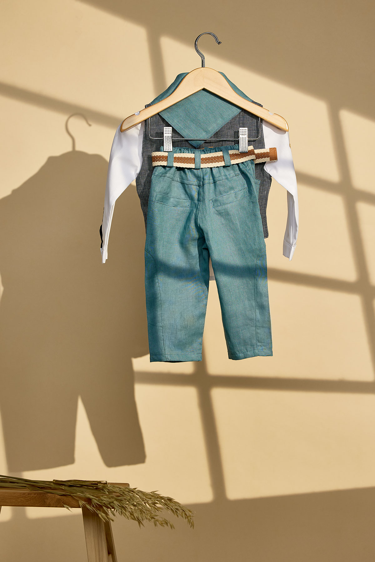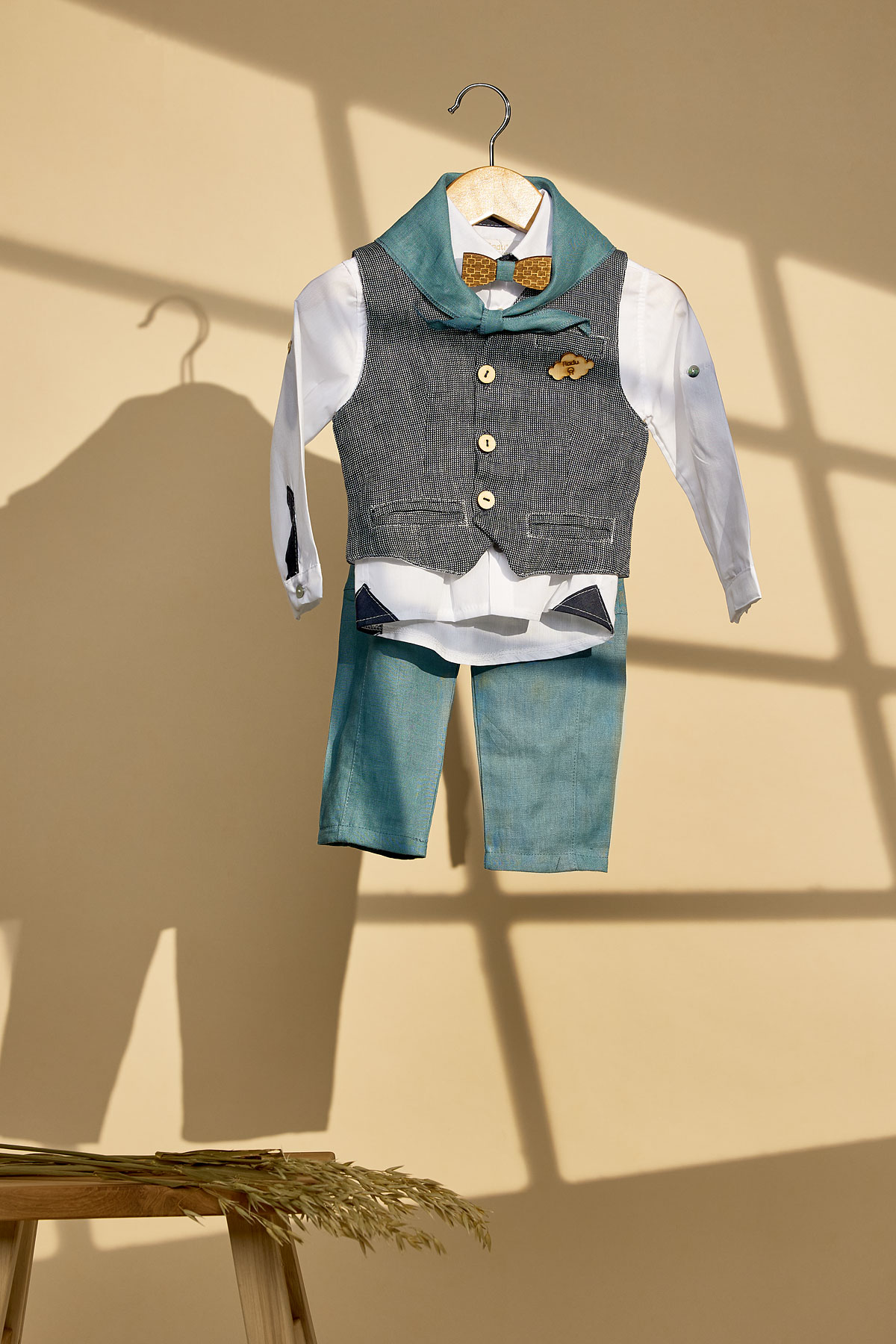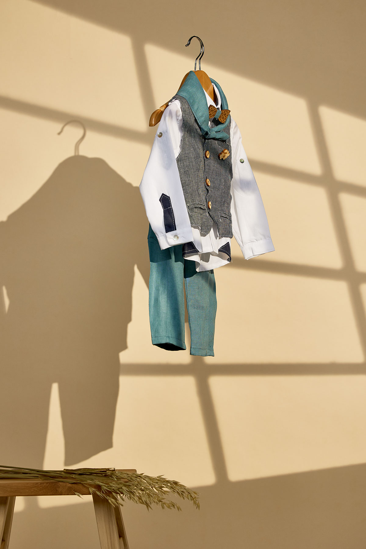 Βαπτιστικό σύνολο αγόρι με πετρόλ λινό ύφασμα και μπλε γιλέκο ψαροκόκκαλο