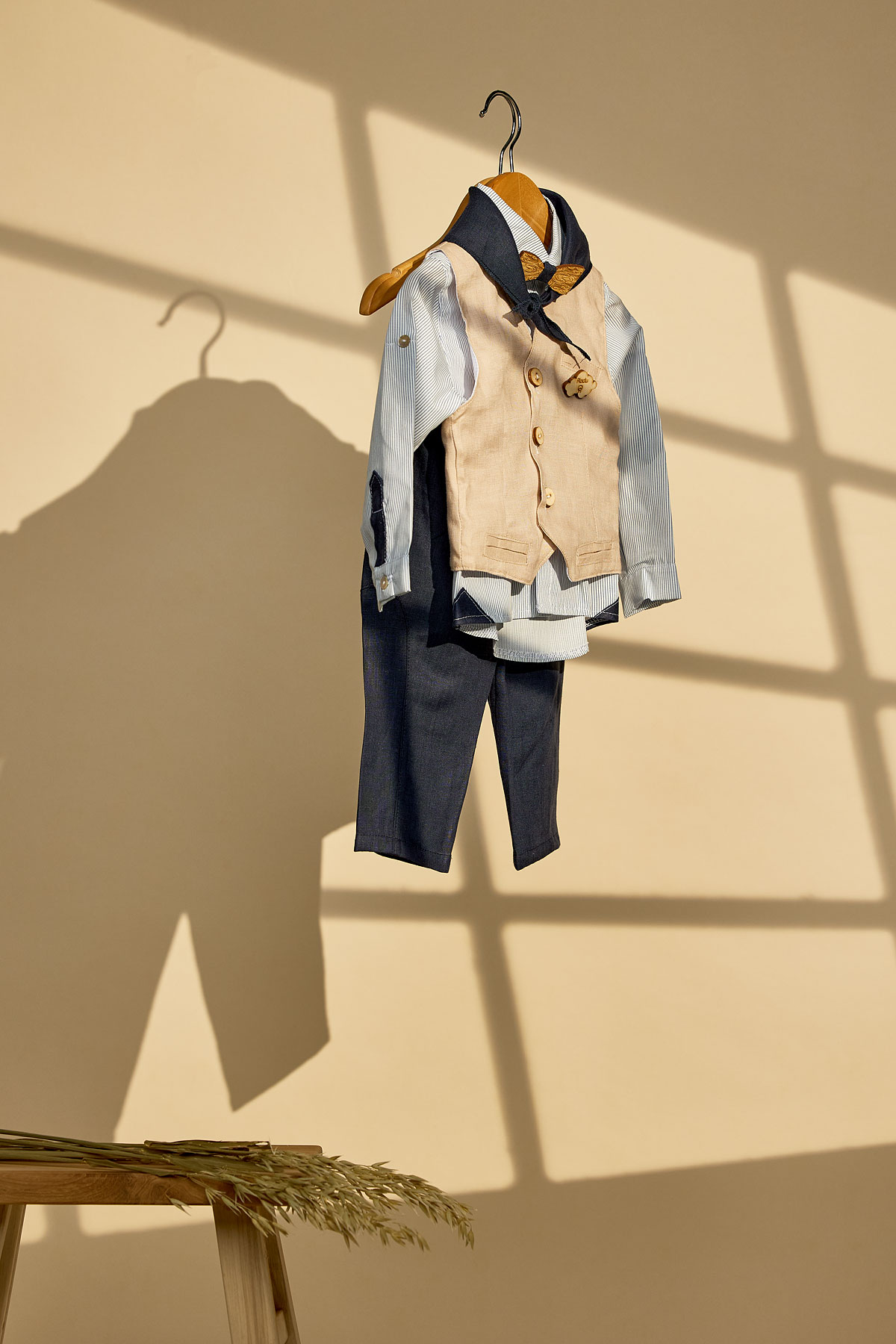 Βαπτιστικό σύνολο με μπεζ παντελόνικαι μπλε γιλέκο ψαροκόκκαλο