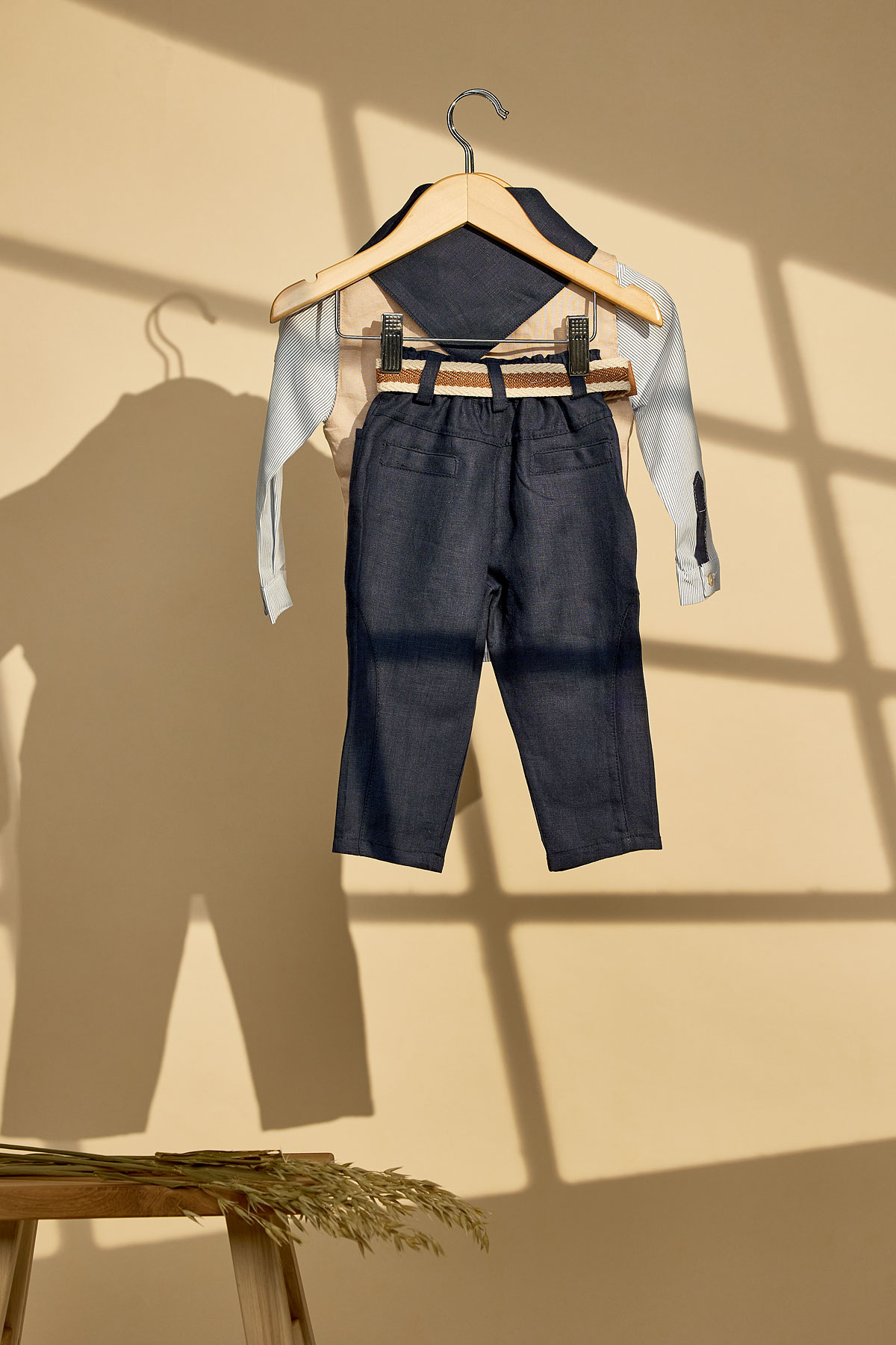 Βαπτιστικό σύνολο αγόρι με ριγιέ πουκάμισο και μπλε λινό παντελόνι