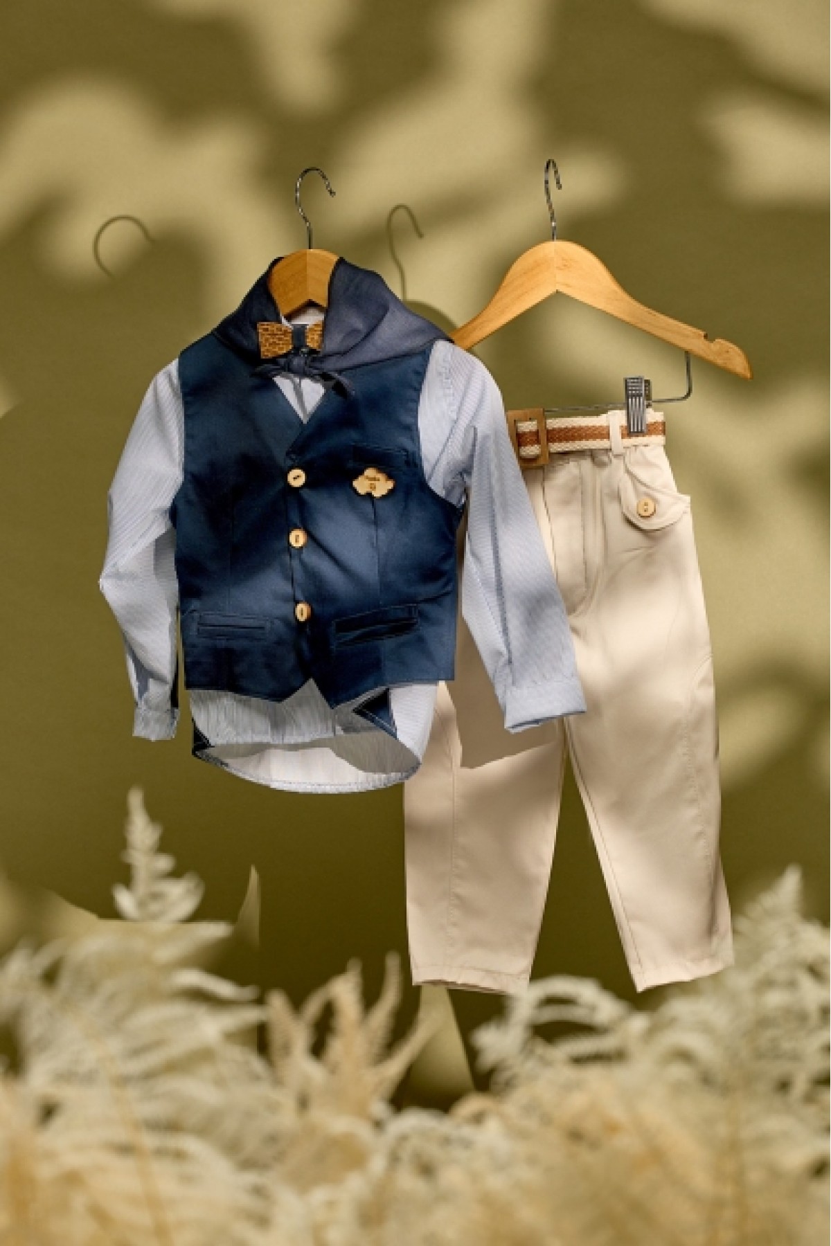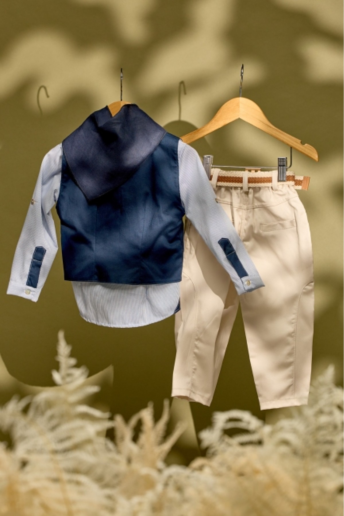 Μία επιλογή βαπτιστικού συνόλου που παραπέμπει σε μία επιλογή ανέμελη, ανεπιτίδευτη αλλά προσεγμένη στις λεπτομέρειές του. Το πουκάμισο είναι από υπόλευκη βαμβακερή μουσελίνα και έχει λεπτομέρειες από βαμβακερό δίχτυ. Το λευκό μπλουζάκι εσωτερικά ''ανοίγει'' το χρωματικό συνδυασμό του συνόλου του ρούχου και η επιλογή του εκρού παντελονιού δίνει μία αθώα και ήσυχη ματιά στο σύνολο. Στη θέση ενός πιο κλασικού γιλέκου υπάρχει το ανοιχτό πουκάμισο και το τριγωνικό φουλάρι με τα αφαιρετικά αγριολούλουδα στο σχέδιό του το οποίο μας παραπέμπει σε ένα πιο ανεπιτήδευτο look. Στην τιμή περιλαμβάνεται το ψάθινο καπέλο.