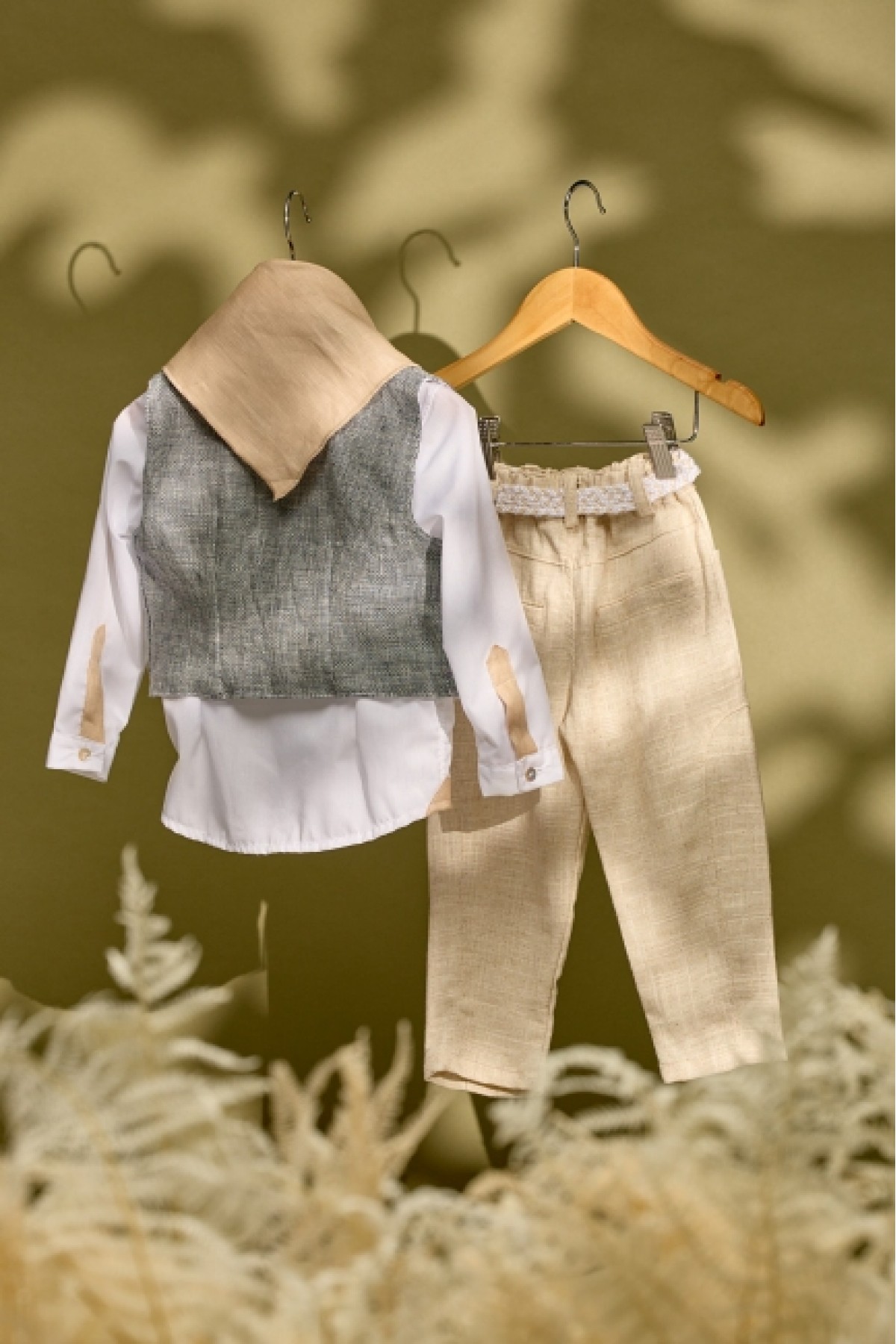 Βαπτιστικό σύνολο με χακί παντελόνι και μπεζ γιλέκο με λευκό πουκάμισο