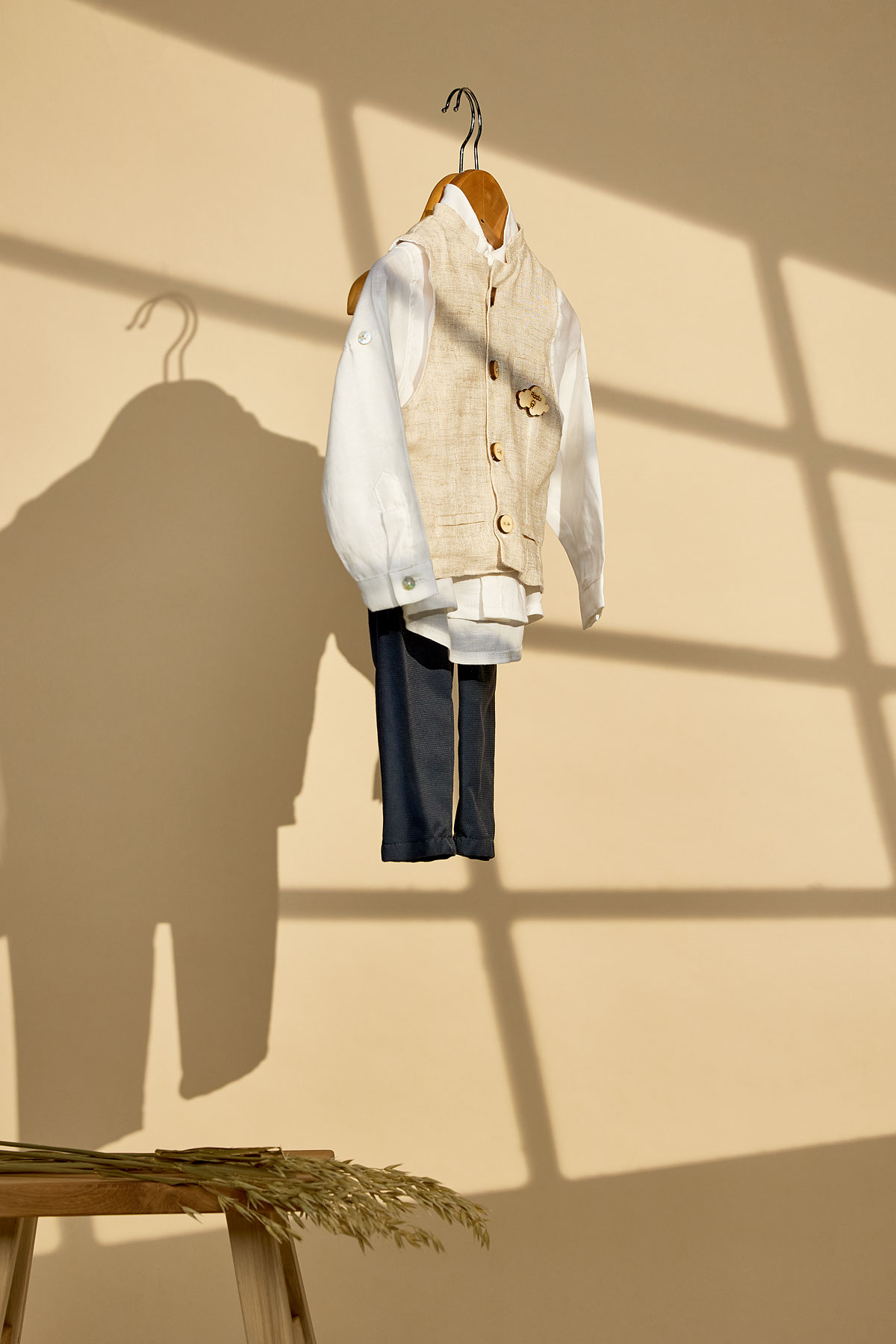Βαπτιστικό σύνολο με λινό μάο πουκάμισο και γιλέκο και μπλε παντελόνι