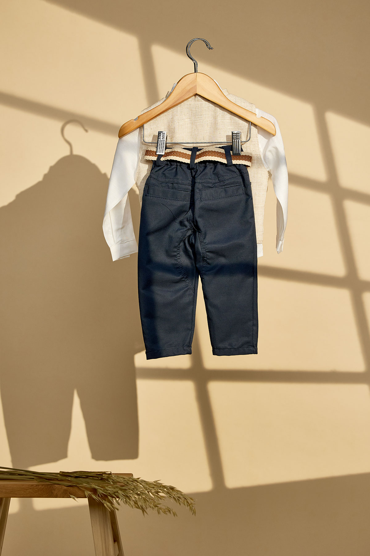 Βαπτιστικό σύνολο με μπεζ παντελόνικαι μπλε γιλέκο ψαροκόκκαλο