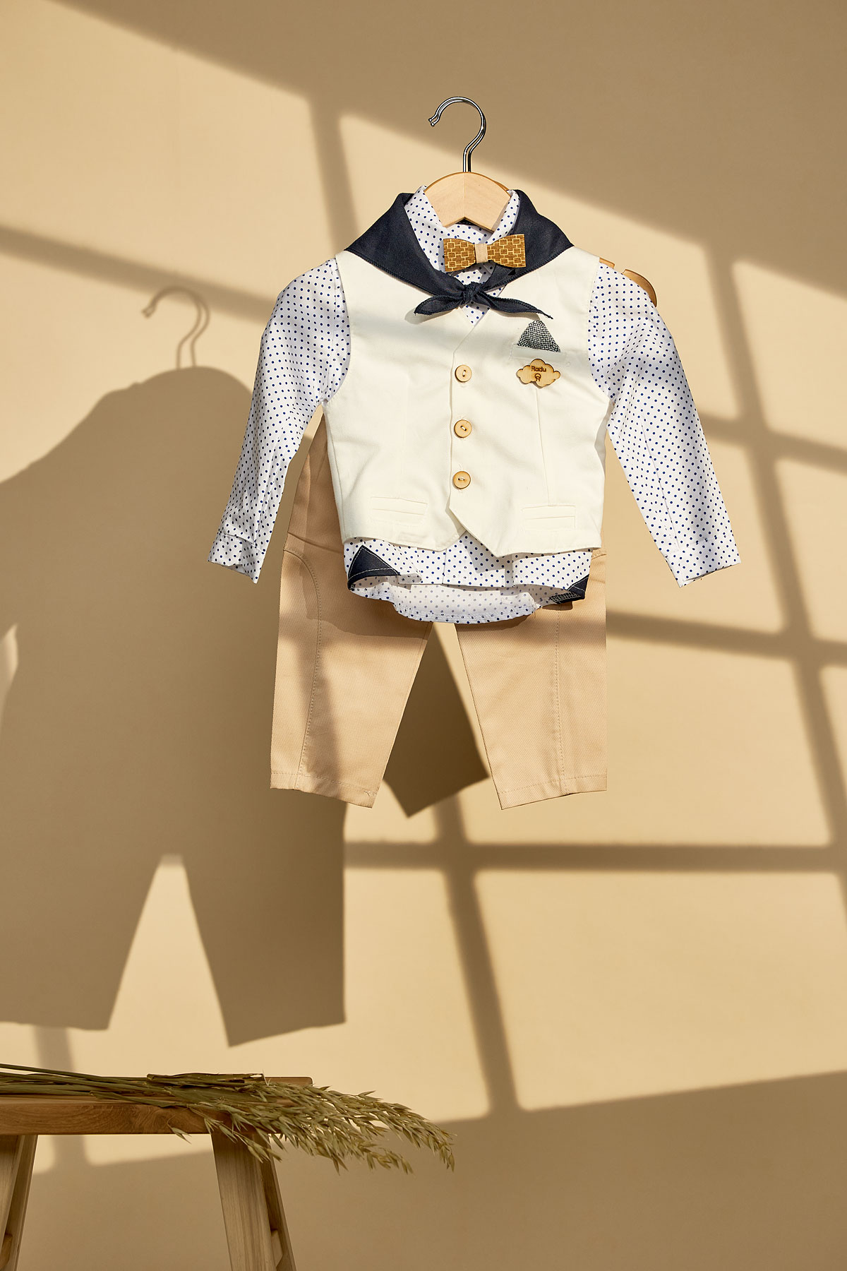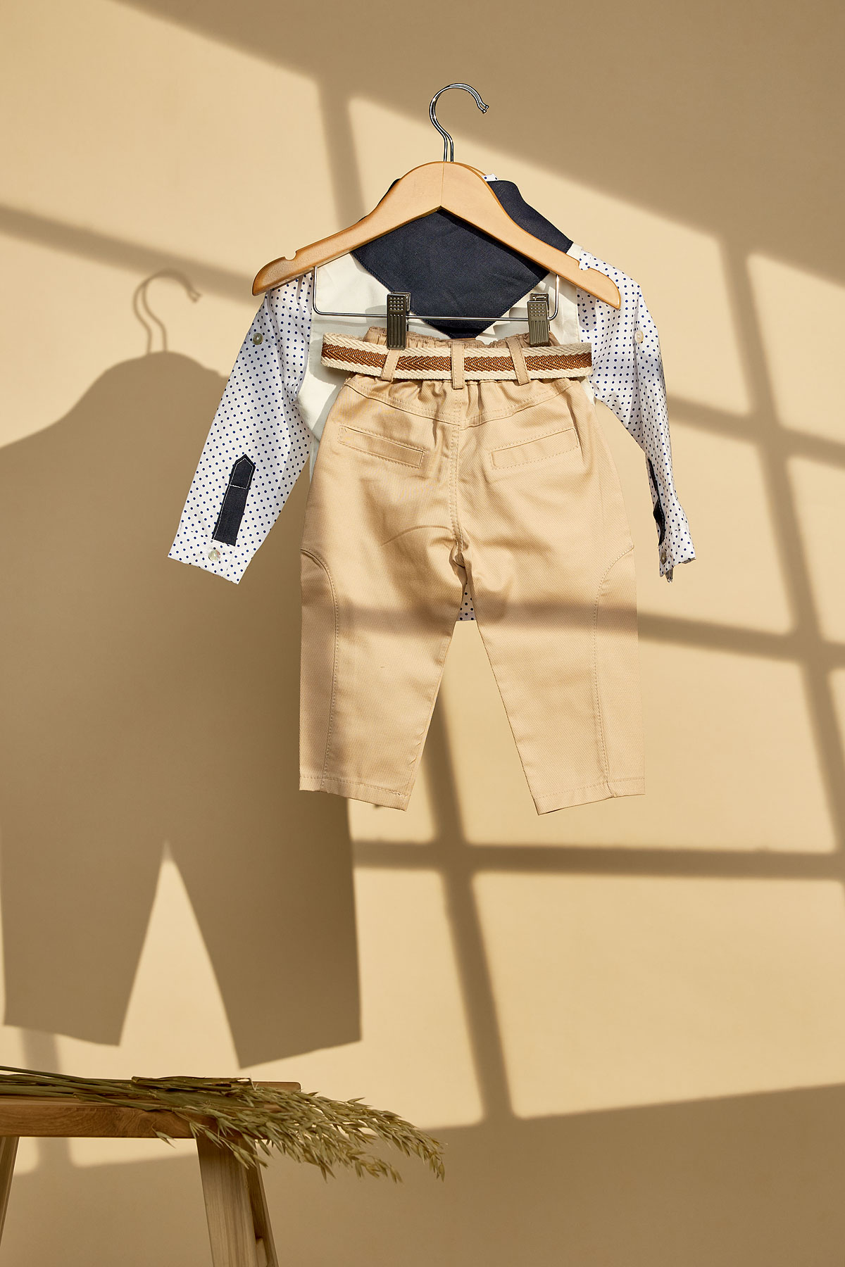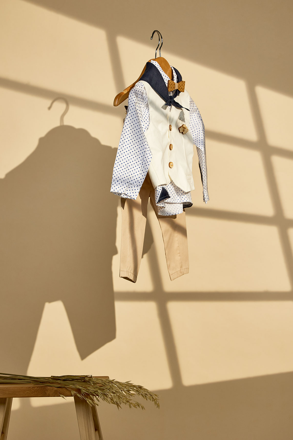 Βαπτιστικό σύνολο με μπεζ παντελόνι και πουά πουκάμισο