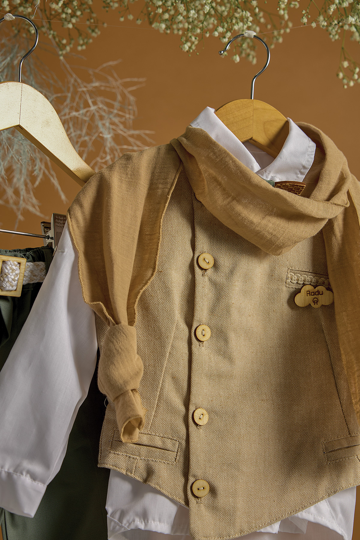 Βαπτιστικό σύνολο με χακί παντελόνι και μπεζ γιλέκο με λευκό πουκάμισο