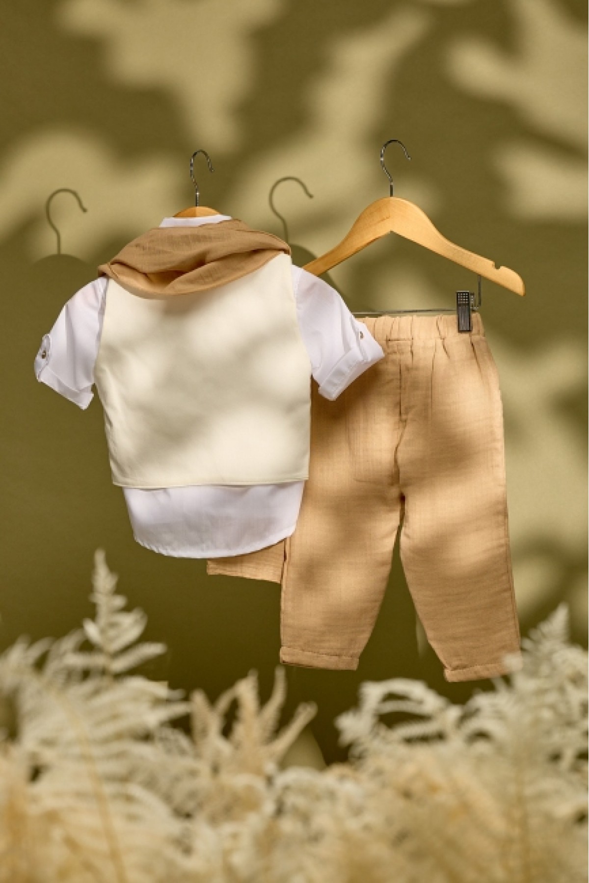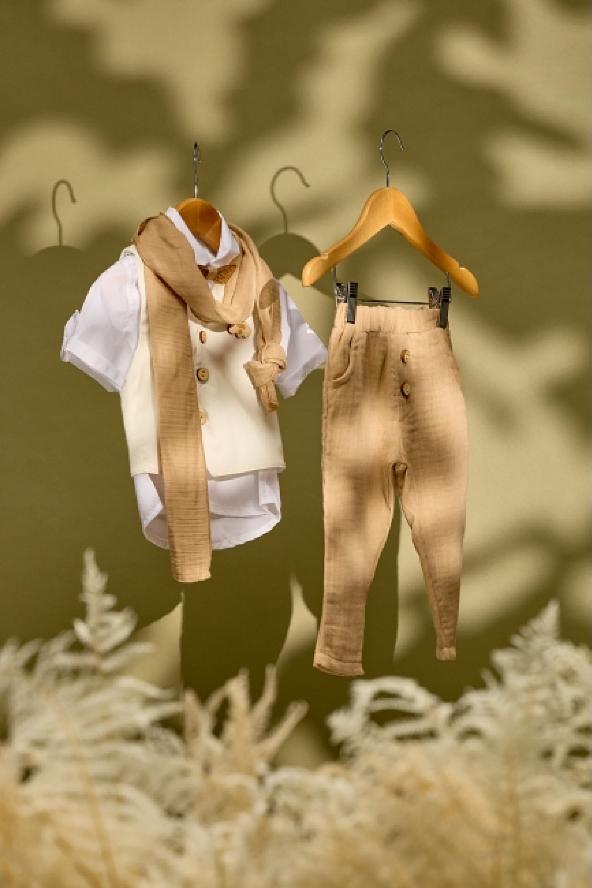 Βαπτιστικό σύνολο μπεζ βαμβακερό παντελόνι τσαλακωτή μουσελινα και υπόλευκο γιλέκο