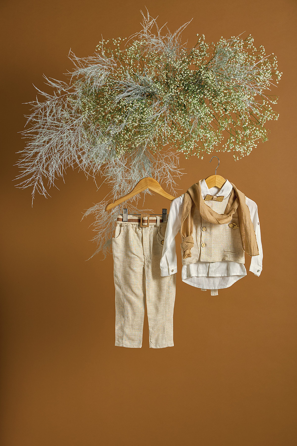 Ένα βαπτιστικό σύνολο στα χρώματα της άμμου. Για όσους αγαπάμε τα απαλά χρώματα και τις γήινες επιλογές χωρίς εντάσεις. Ένα σύνολο ”ήσυχο” με χυτά και μαλακά υφάσματα και στο παντελόνι-γιλέκο και στο λινό του πουκάμισο
