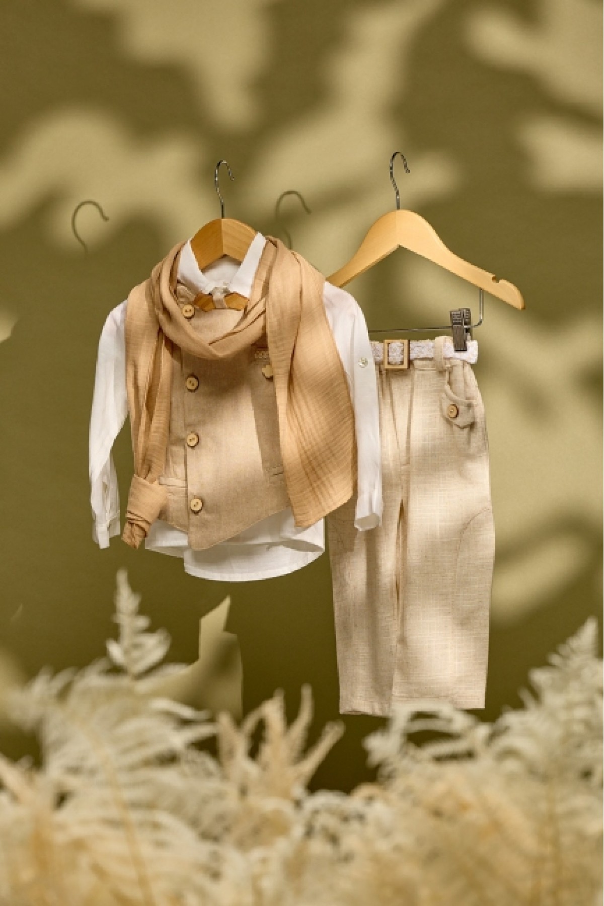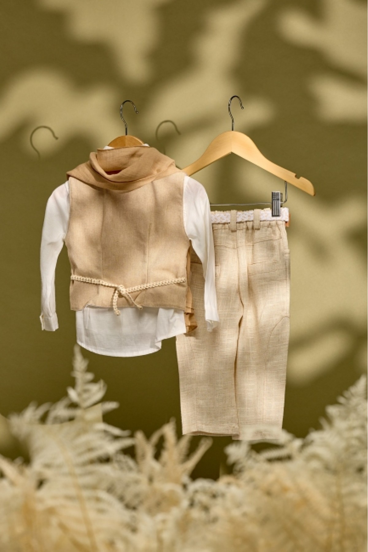Βαπτιστικό σύνολο μπεζ λινό παντελόνι με χακί γιλέκο