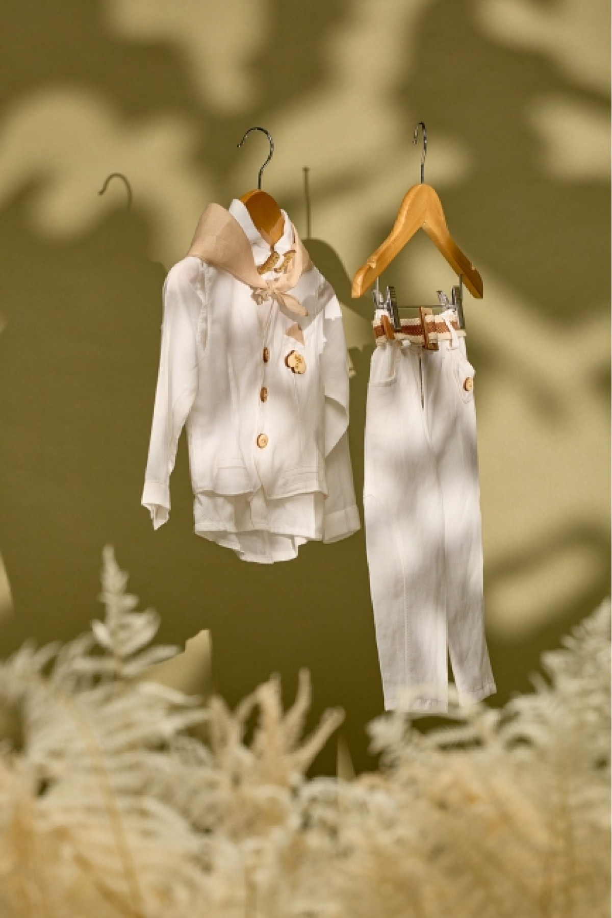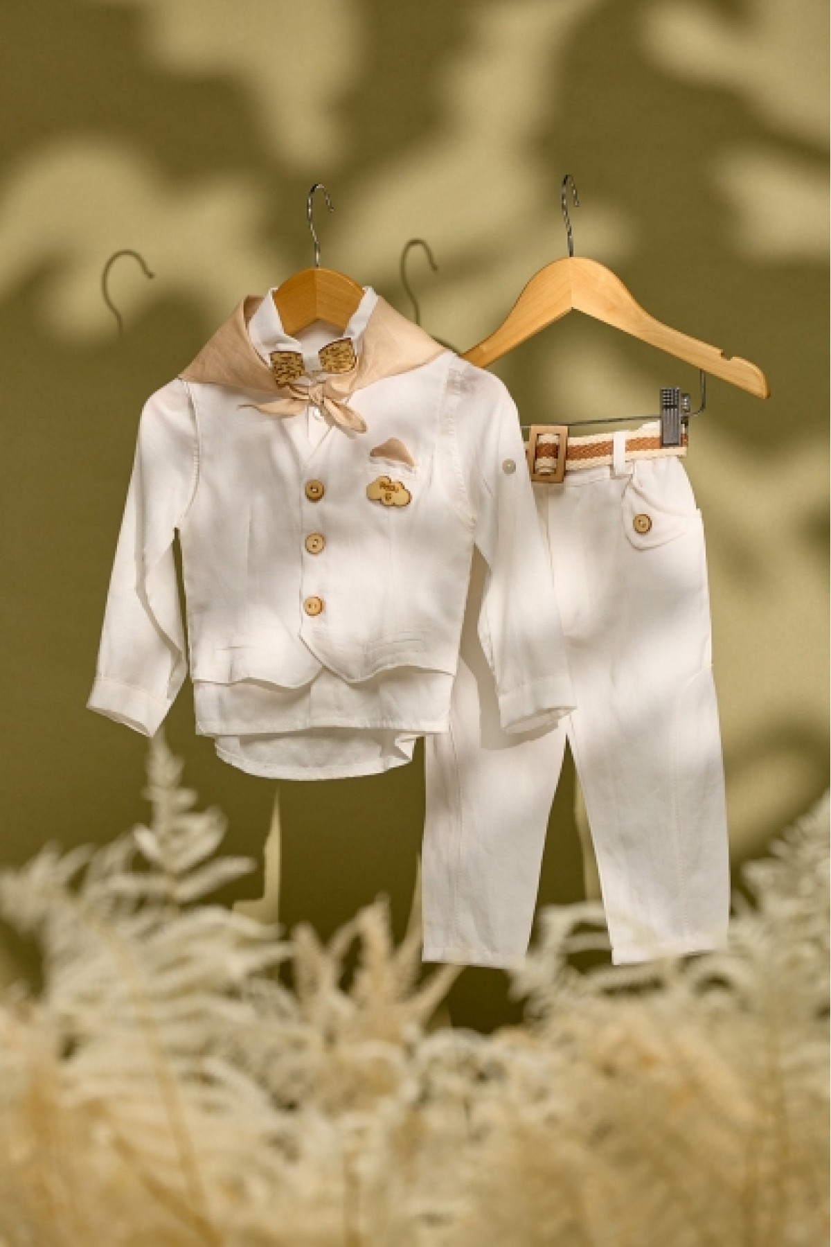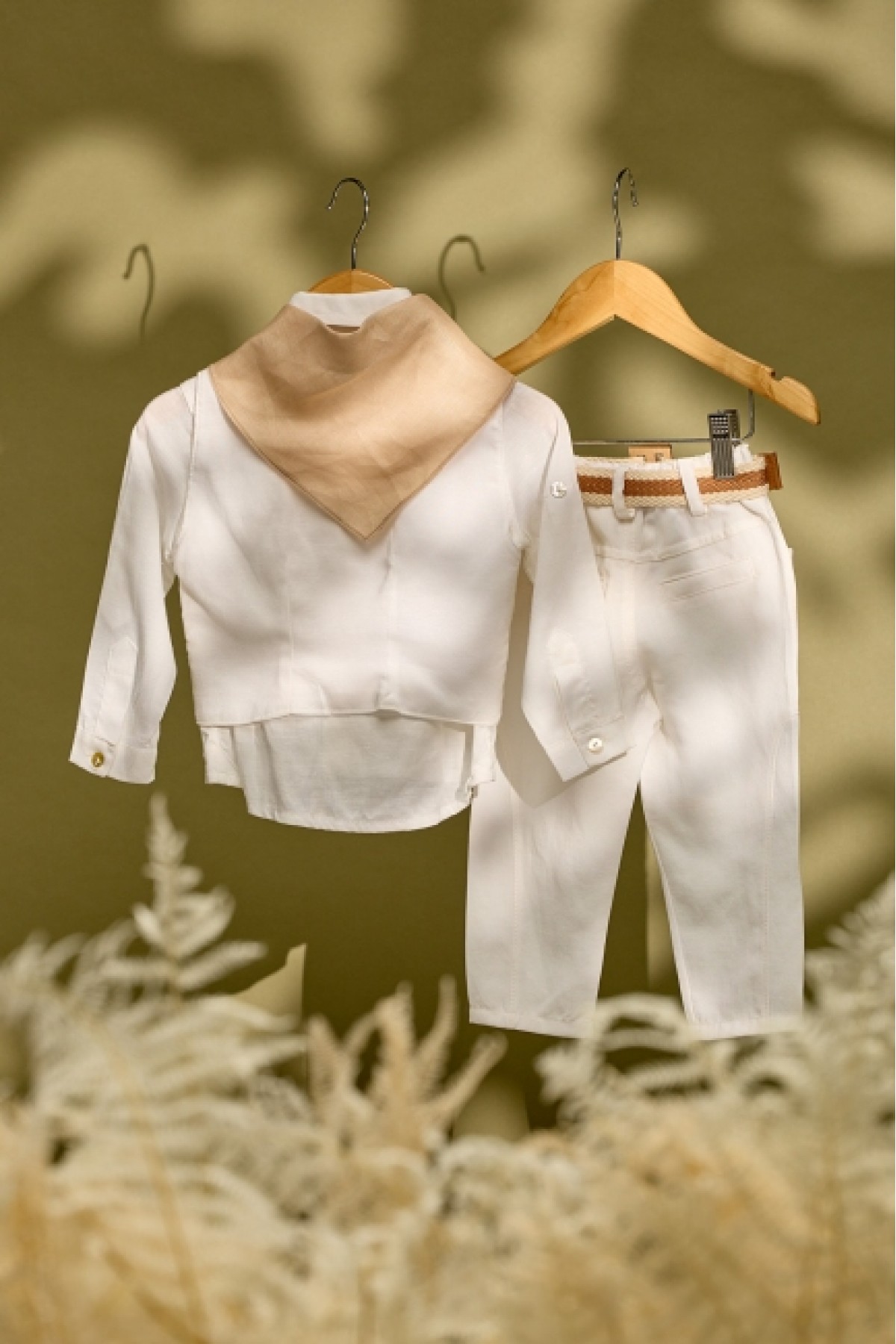 Μία επιλογή βαπτιστικού συνόλου που παραπέμπει σε μία επιλογή ανέμελη, ανεπιτίδευτη αλλά προσεγμένη στις λεπτομέρειές του. Το πουκάμισο είναι από υπόλευκη βαμβακερή μουσελίνα και έχει λεπτομέρειες από βαμβακερό δίχτυ. Το λευκό μπλουζάκι εσωτερικά ''ανοίγει'' το χρωματικό συνδυασμό του συνόλου του ρούχου και η επιλογή του χακί παντελονιού δίνει βάθος στο σύνολο. Στη θέση ενός πιο κλασικού γιλέκου υπάρχει το ανοιχτό πουκάμισο και το τριγωνικό φουλάρι με τα αφαιρετικά αγριολούλουδα στο σχέδιό του το οποίο μας παραπέμπει σε ένα πιο ανεπιτήδευτο look. Στην τιμή περιλαμβάνεται το ψάθινο καπέλο.