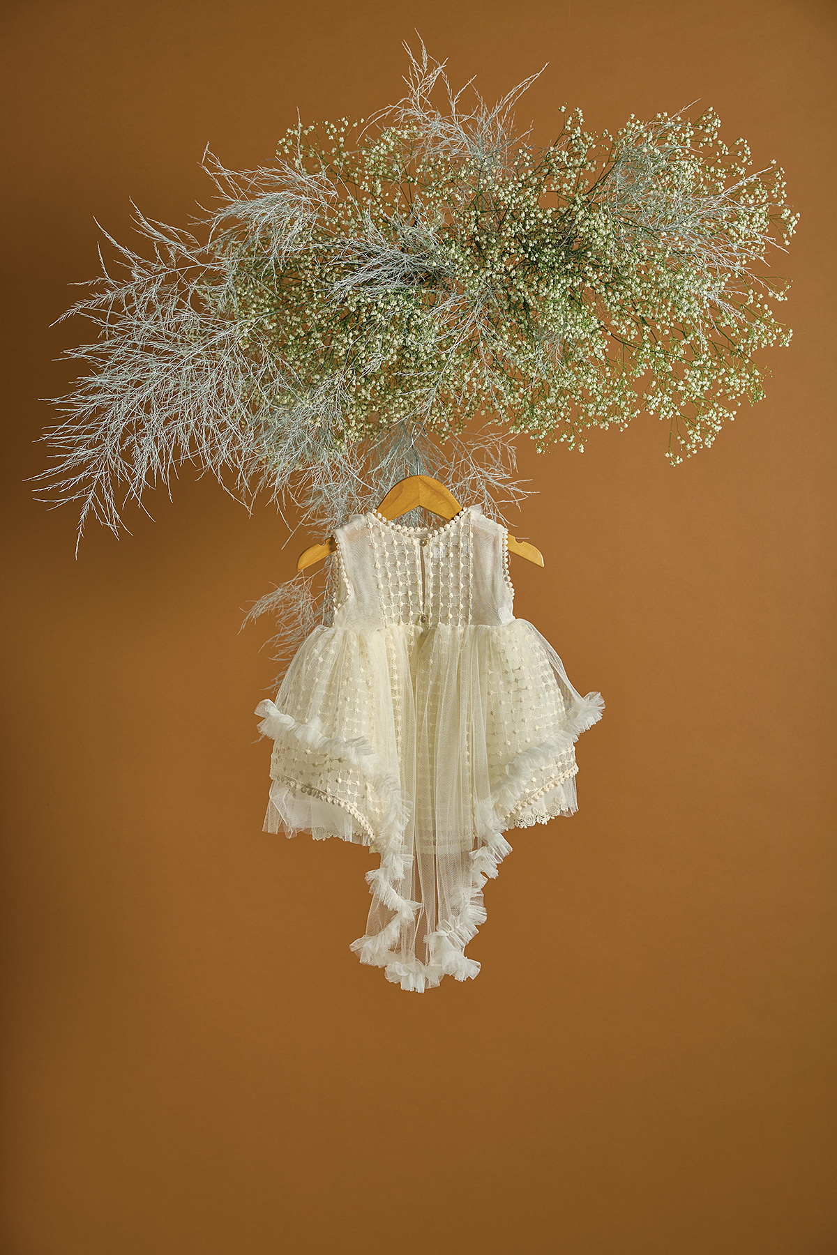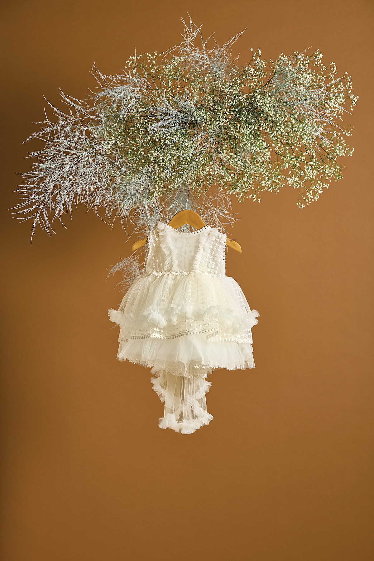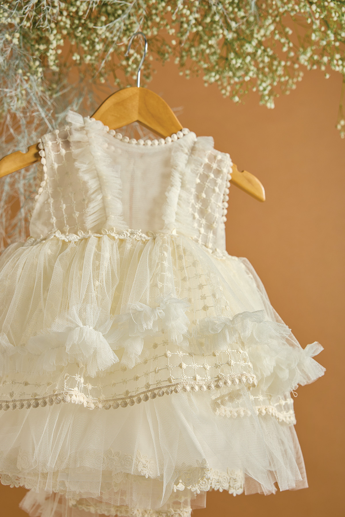 Ένα βαπτιστικό φόρεμα σε εκρού χρώμα με μια ιδιαίτερη δαντέλα ανάγλυφη με επαναλαμβανόμενα ψιλά λουλουδάκια ανάμεσα στο πουά pattern. Η συγκεκριμένη ιδιαίτερη δαντέλα συνδυάζεται με μία τρέσα με τριανταφυλλάκια , η οποία τονίζει τη μέση. Χαρακτηριστικό του συγκεκριμένου φορέματος είναι τα layers από τούλι και δαντ΄΄ελες καθώς και η πιο ”θεατρική” ουρά από τούλι. Συνδυάστε το με εκρού τσάντα και αποξηραμένα λουλούδια του αγρού για ένα πιο ανεπιτήδευτο look.Στην τιμή περιλαμβάνεται και η τούλινη κορδέλα για τα μαλλιά.