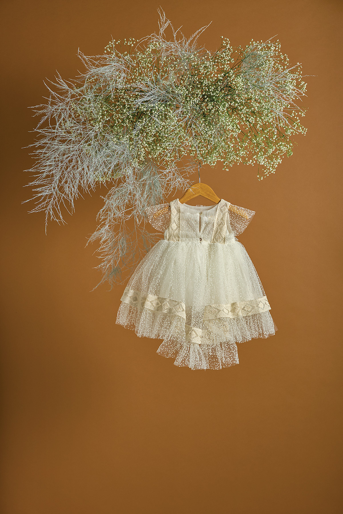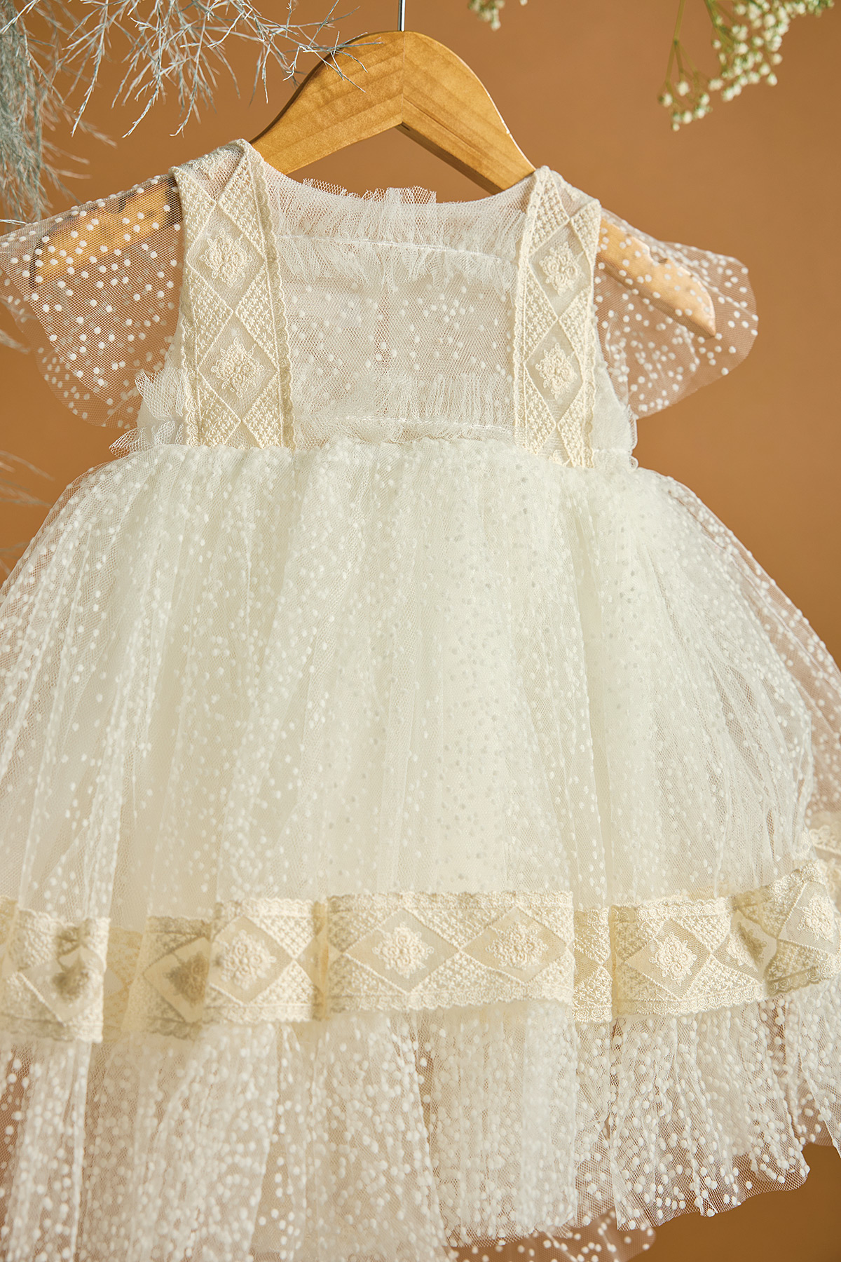 Ένα βαπτιστικό φόρεμα σε εκρού χρώμα και πουά pattern με την αγαπημένη μας διακριτική ουρά στο πίσω μέρος. To πουά τούλι δημιουργεί βολάν στο τελείωμα του φορέματος. Έτσι δημιουργείται όγκος και κίνηση στο φόρεμα. Η δαντέλα στο μπούστο και στην πλάτη συναντάται και στο τε΄λείωμα του φορέματος στη βάση του πουά βολάν. Με αυτόν τον τρόπο τονίζεται το βολάν του φορέματος. Συνδυάστε το με εκρού χειροποίητη τσάντα και βουάλ φιόγκο ημιδιάφανο με αποξηραμένα και υφασμάτινα λουλούδια. Στην τιμή περιλαμβάνεται και η τούλινη κορδέλα για τα μαλλιά.