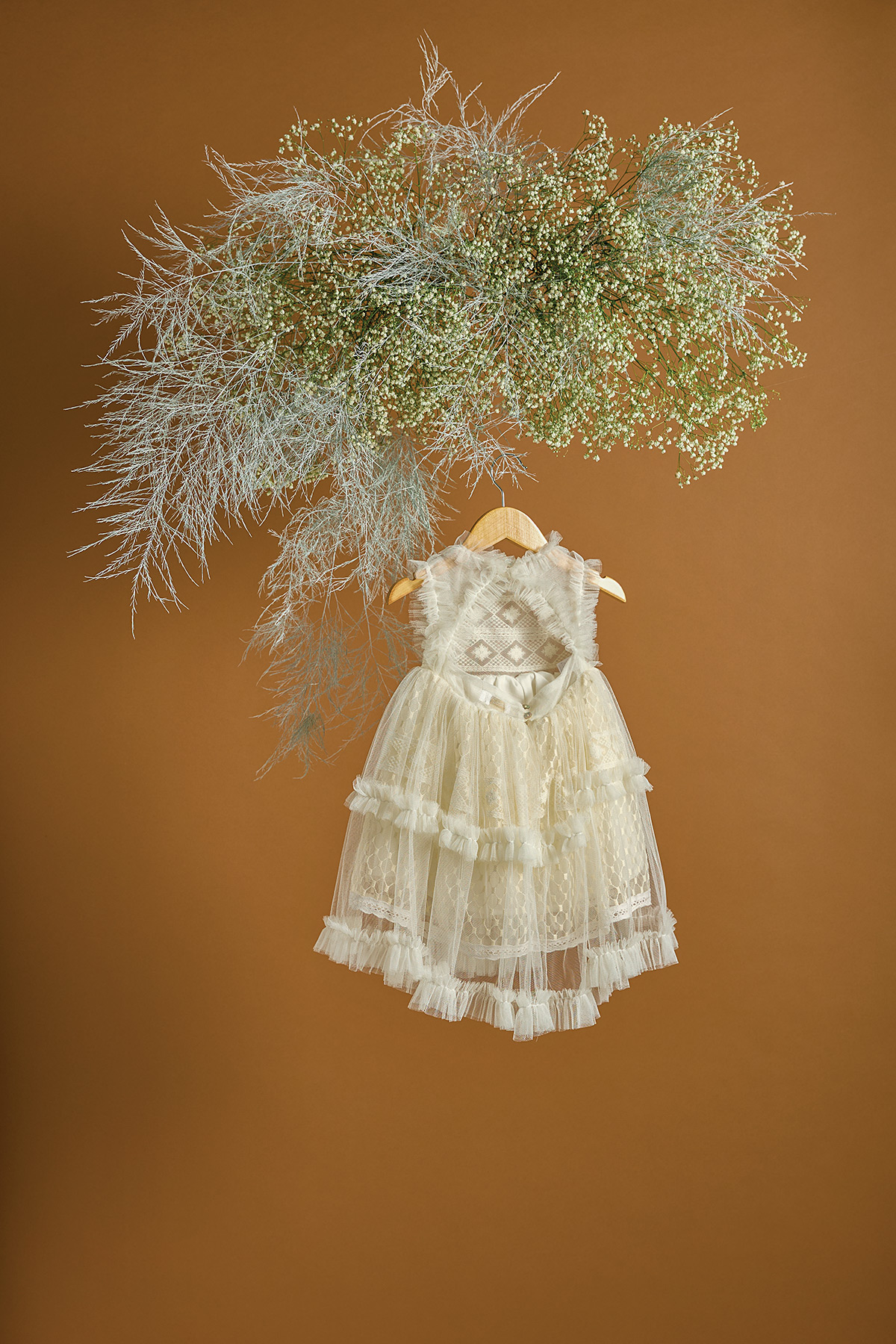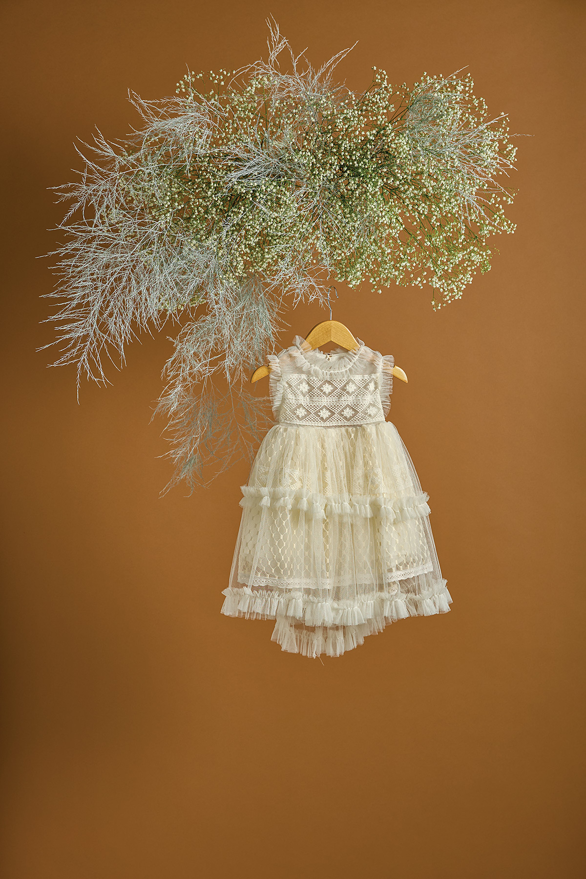 Ένα βαπτιστικό φόρεμα σε εκρού χρώμα με μια ιδιαίτερη δαντέλα ανάλυφη σε σχήμα ρόμβων και επαναλαμβανόμενο pattern ορθογωνίων. Η συγκεκριμένη ιδιαίτερη δαντέλα συνδυάζεται με μία τρέσσα με τριανταφυλλάκια μέσα σε έναν ρόμβο. Χαρακτηριστικό του συγκεκριμένου φορέματος είναι και οι αγαπημένες μας τούλινες σουρωμένες τρέσσες σε διάφορα σημεία του φορέματος στον κορμό και στη φούστα για περισσότερη ένταση.Στην τιμή περιλαμβάνεται και η τούλινη κορδέλα για τα μαλλιά.